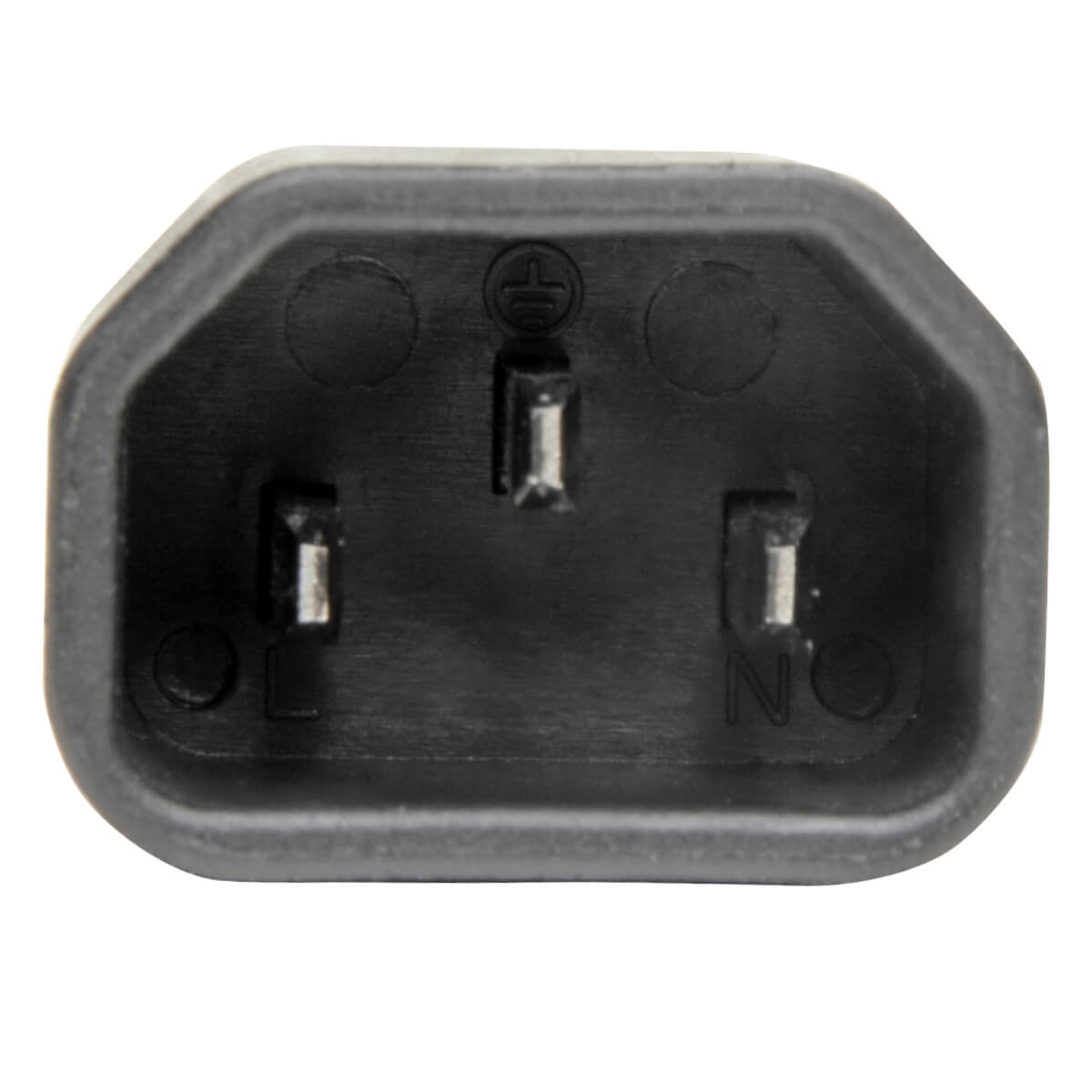 This UL-listed C14 to C5 power cord adapter converts a C6 plug into a C14 connector and is ideal for a device’s built-in power cord that doesn’t match an available outlet. You can use this adapter to connect a notebook computer, laptop or other device with a three-slot C6 power cord to a surge protector or UPS system with a C13 outlet.
