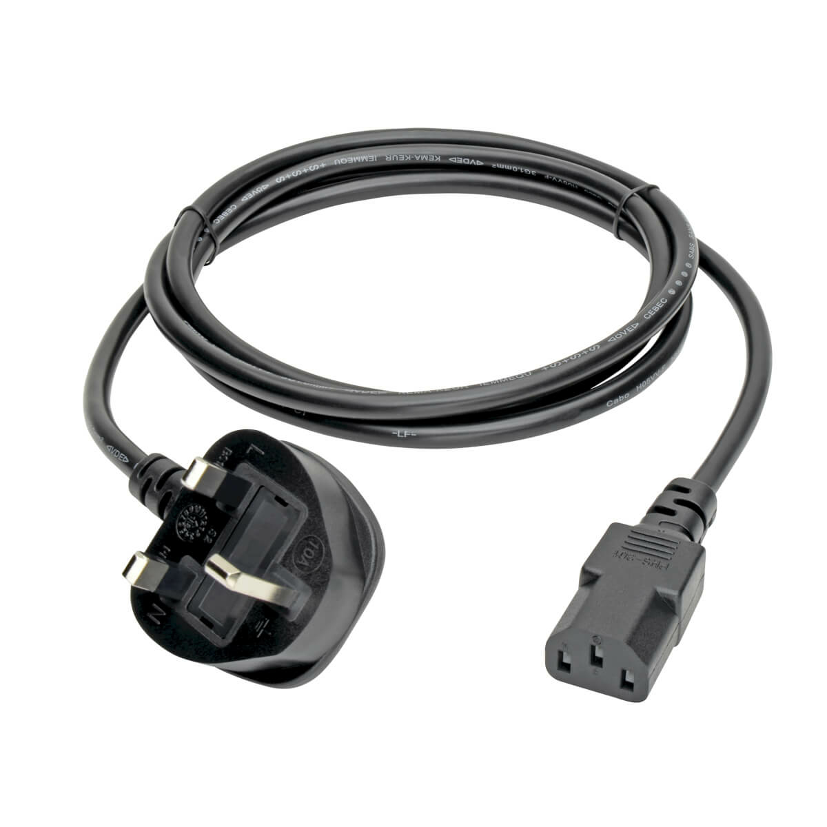 This BS1363 to C13 UK computer power cord is designed for small data center or office workstation applications that do not require a heavy-gauge connection. The cable can be used to connect a computer, server or drive to a BS1363 wall outlet, UPS system or PDU or replace or upgrade a worn-out or lost power cable. The 6-ft. (1.83 m) length allows you flexibility in placing equipment with respect to the power outlet.