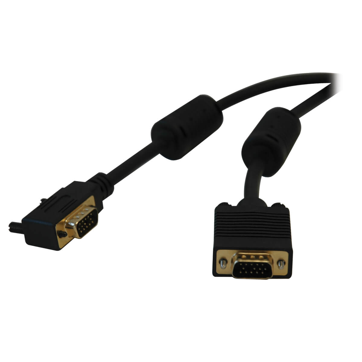 The P502-025-RA VGA Coaxial High-Resolution Monitor Cable (M/M) allows you to connect your VGA-enabled computer and monitor up to 25-ft. (7.62 m) apart. Constructed from mini-coaxial (RGB) and paired video wire, it supports video resolutions up to 2048 x 1536, including 1080p, with no ghosting. One HD15 connector is fixed at a 90-degree angle to allow more room for the cable and allow equipment to be pushed flush against a wall.