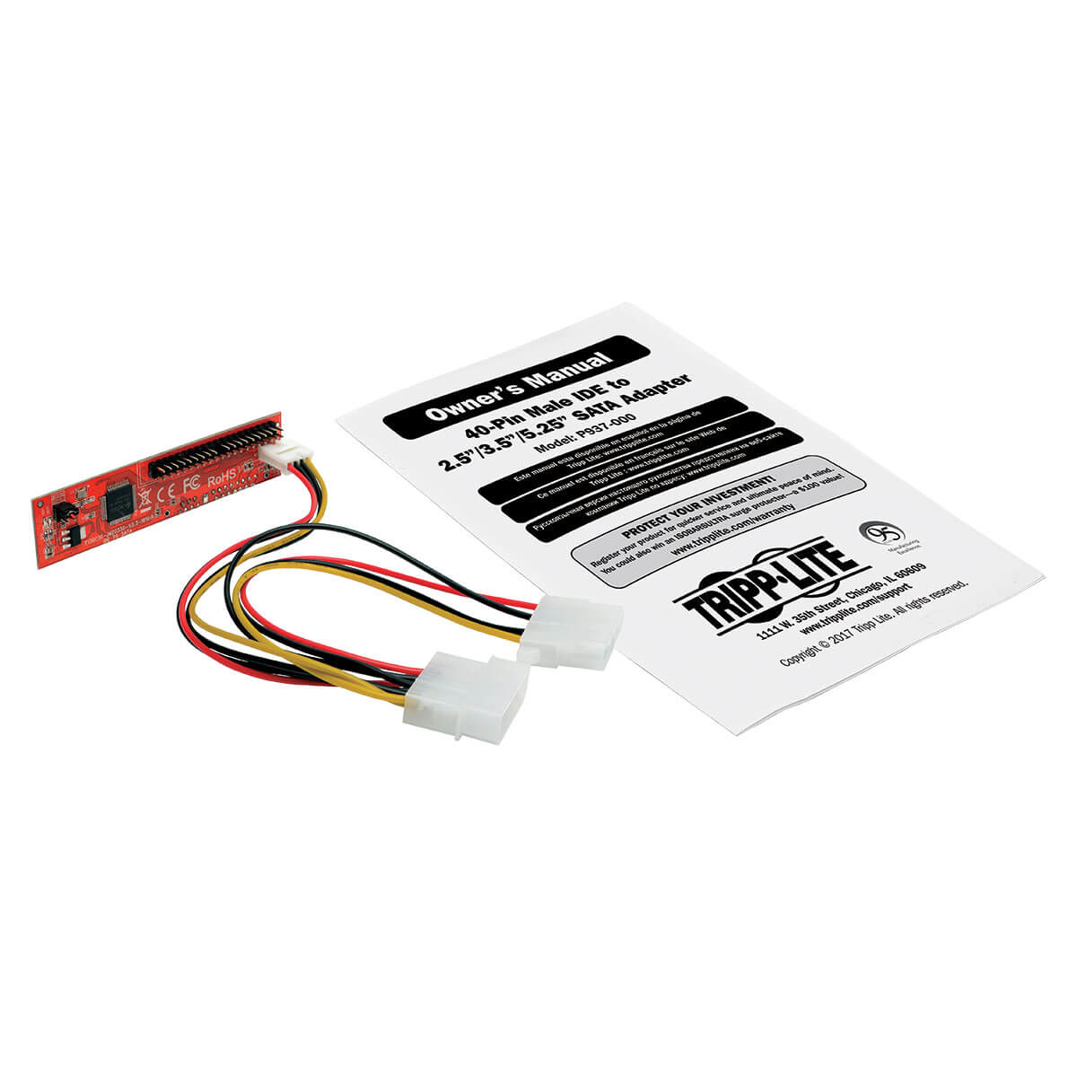 The P937-000 40-Pin Male IDE to SATA Adapter connects a 2.5-, 3.5- or 5.25-inch SATA SSD or HDD to your computer’s older IDE/ATA motherboard. This lets you back up important data, retrieve data from an old internal hard drive, or store information on a drive you can take with you to another computer. By connecting your SATA III, SATA II or SATA I drive to an existing motherboard that does not support SATA, the P937-000 saves you the time, effort and expense of upgrading to a new motherboard.