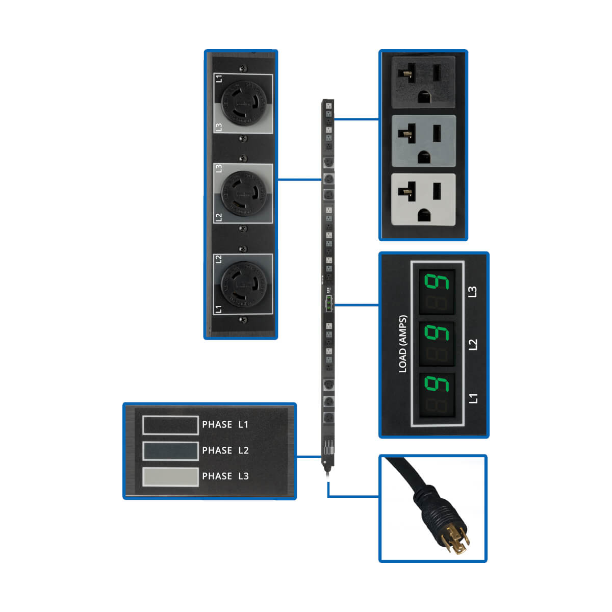 Tripp Lite 3 phase Metered PDU / Power Distribution Units offer real-time local reporting of current levels in amps via set of 3 built-in digital meters. Enables visual monitoring of PDU current levels to preserve proper loading balance and prevent circuit overloads as additional equipment is added. Offers reliable rackmount multi-outlet power distribution from any protected UPS, generator or mains input power source. High quality design includes rugged all-metal housing and secure rackmount installation with included mounting accessories.