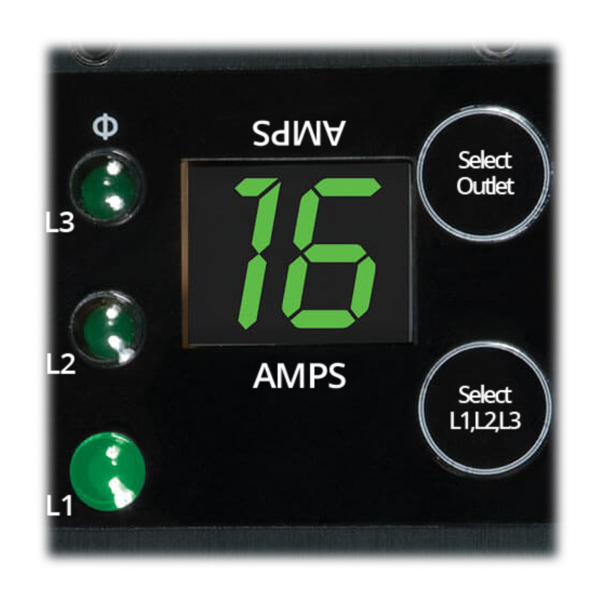 - Lighted display with scroll-button reports power consumption in amps for all 3 loading banks, IP-address self-identification and 180 degree display rotation for overhead or raised floor power feeds