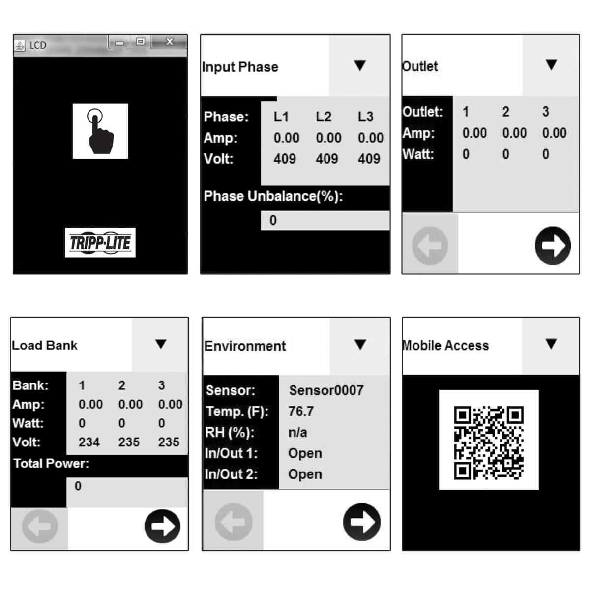An easy-to-navigate color touchscreen LCD reports network data, including IP address, input current level per phase, and output current per load bank with ±1% billing-grade accuracy. It also generates a unique QR code to allow read-only access to the 0U PDU via mobile device. If an EnviroSense2 module is connected to the 3-phase PDU, the LCD also displays status and environmental data, such as temperature and humidity.