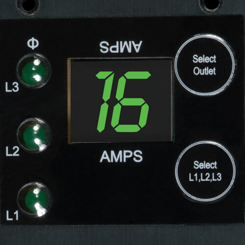 Lighted display with scroll-button reports power consumption in amps for all 3 loading banks, IP-address self-identification and 180 degree display rotation for overhead or raised floor power feeds.