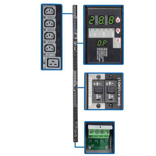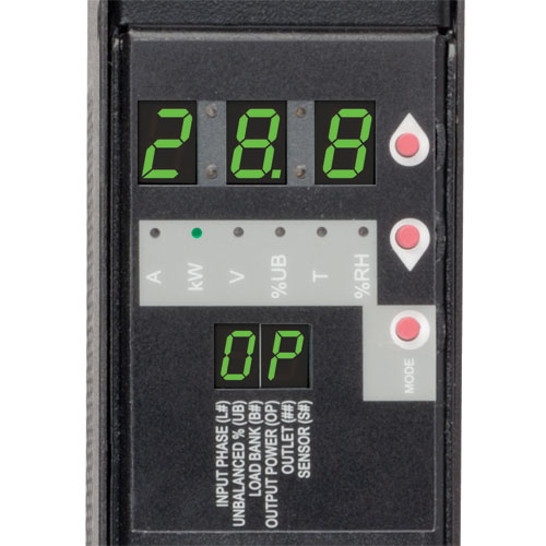 ● Built-in local digital display and remote web/network interface reports detailed voltage, amperage and kilowatt output values per outlet, per breaker and per phase with additional reporting options for power unbalance percentage, IP address and sensor based temperature and humidity data (requires ENVIROSENSE sensor)