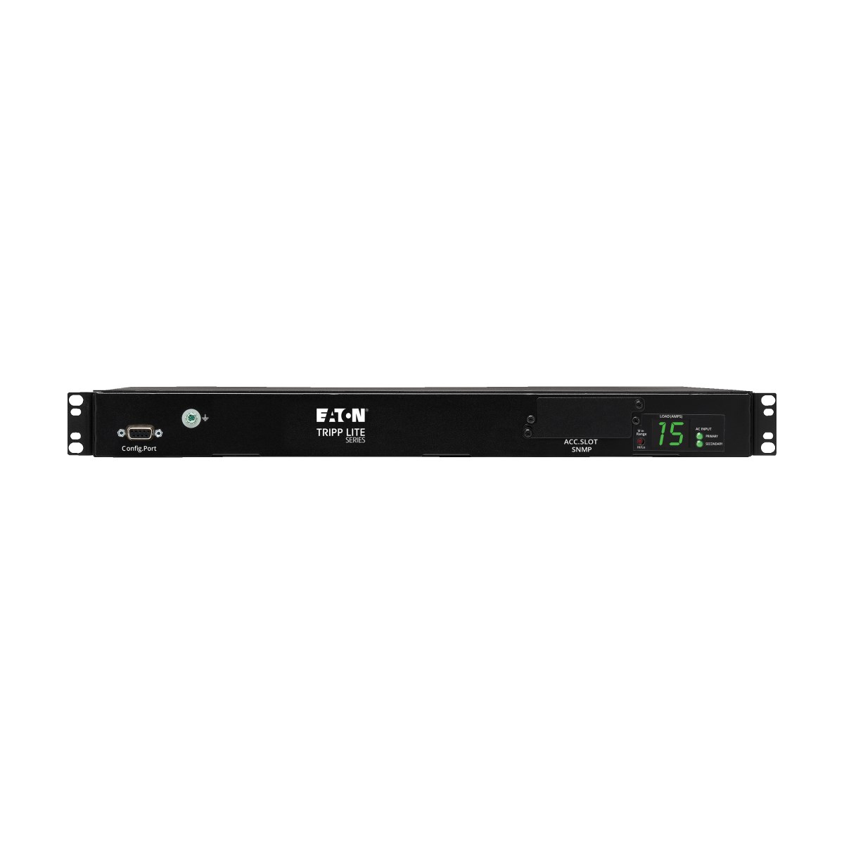 Built-in slot supports the optional WEBCARDLX (sold separate), which turn the PDUMH15HVAT into a switched PDU by allowing remote access to the PDU for power monitoring, configuration, outlet control and notifications via web browser, SSH, telnet or SNMP. Digital ammeter monitors total output current. LEDs display outlet on/off status and input power status on primary and secondary inputs.