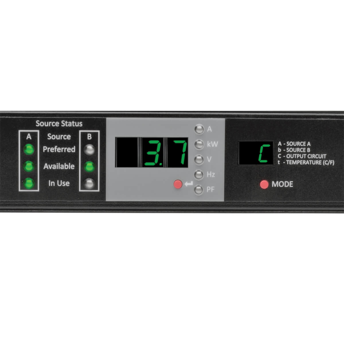 Built-in LX Platform network management interface. The Java-free LX Platform HTML5-based network interface enables full remote access for PDU status monitoring and email notifications via secure web browser, SNMP, telnet or SSH. It supports 10/100 Mbps auto-sensing for optimum communication with an Ethernet network. Optional EnviroSense2 modules (sold separate) provide a variety of environmental monitoring capabilities. Protocols supported include HTTP, HTTPS, SMTP, SNMPv1, SNMPv2, SNMPv3, telnet, SSH, FTP, DHCP and NTP. Digital display with LEDs indicates power availability, voltage, input status for both power sources, output load and power factor, as well as temperature and humidity conditions with optional ENVIROSENSE2 module (sold separate).