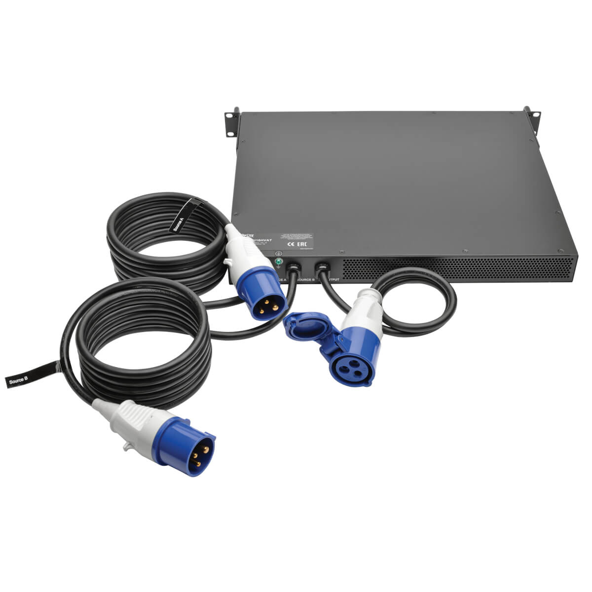 Dual 10-ft. (3.05 m) input cords with IEC309 16A Blue plugs connect to separate primary and secondary single-phase power sources, including out-of-phase sources. The PDU constantly evaluates the power quality of both input sources. Dynamic solid-state (TRIAC) automatic transfer switching allows the PDU to switch to the secondary source within 1–5 milliseconds if the primary source fails or becomes unstable to ensure connected equipment remains powered.