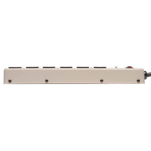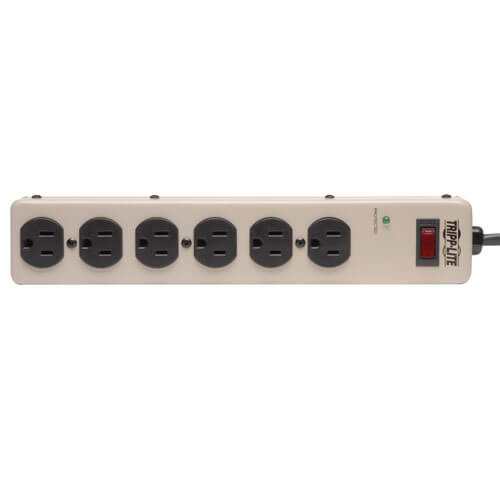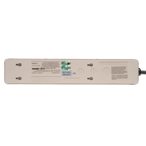 The Waber-by-Tripp Lite PM6NS Power Strip offers a convenient method of power distribution and surge suppression in workbench, wallmount or floor mount applications. Includes 6 NEMA 5-15R output receptacles, 6 foot AC line cord and keyhole mounting tabs for installation in a wide variety of applications. Protects connected equipment from transient surges and line noise with built in surge suppression rated at 900 joules. Corded, multi-outlet strip reduces cabling clutter and enables the connection of multiple electrical devices to a single AC wall socket. Features metal housing, lighted power switch with integrated 15 amp resettable circuit breaker and attractive beige housing with black output receptacles and power cord. Lifetime warranty.
