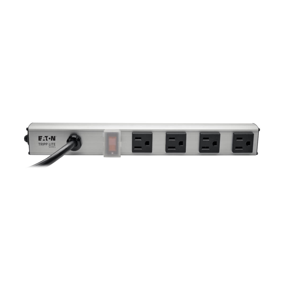 The PS120406 provides a 15-amp, 120v power strip with 4 standard NEMA 5-15R outlets in a rugged, all-metal, mountable housing. It allows for both vertical and horizontal mounting, making it ideal for a variety of uses including office, rackmount, workbench, industrial and telecom applications. With a NEMA 5-15P, 6-ft. power cord, you don't have to install the PS120406 next to outlets you already have; it can be mounted across the room and deliver reliable service where you need it most. A lighted and covered On/Off switch helps prevent accidental shut-offs, while a 15-amp circuit breaker guards against dangerous circuit overloads. Its sturdy all-metal extruded aluminum housing stands up to demanding network, laboratory or factory environments.