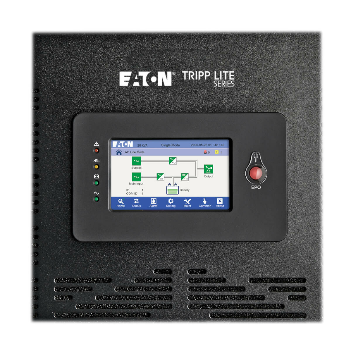 The large five-inch touchscreen LCD panel displays critical operating conditions and diagnostic data, including battery and load status. Four LEDs provide information about AC, bypass, battery and fault status.