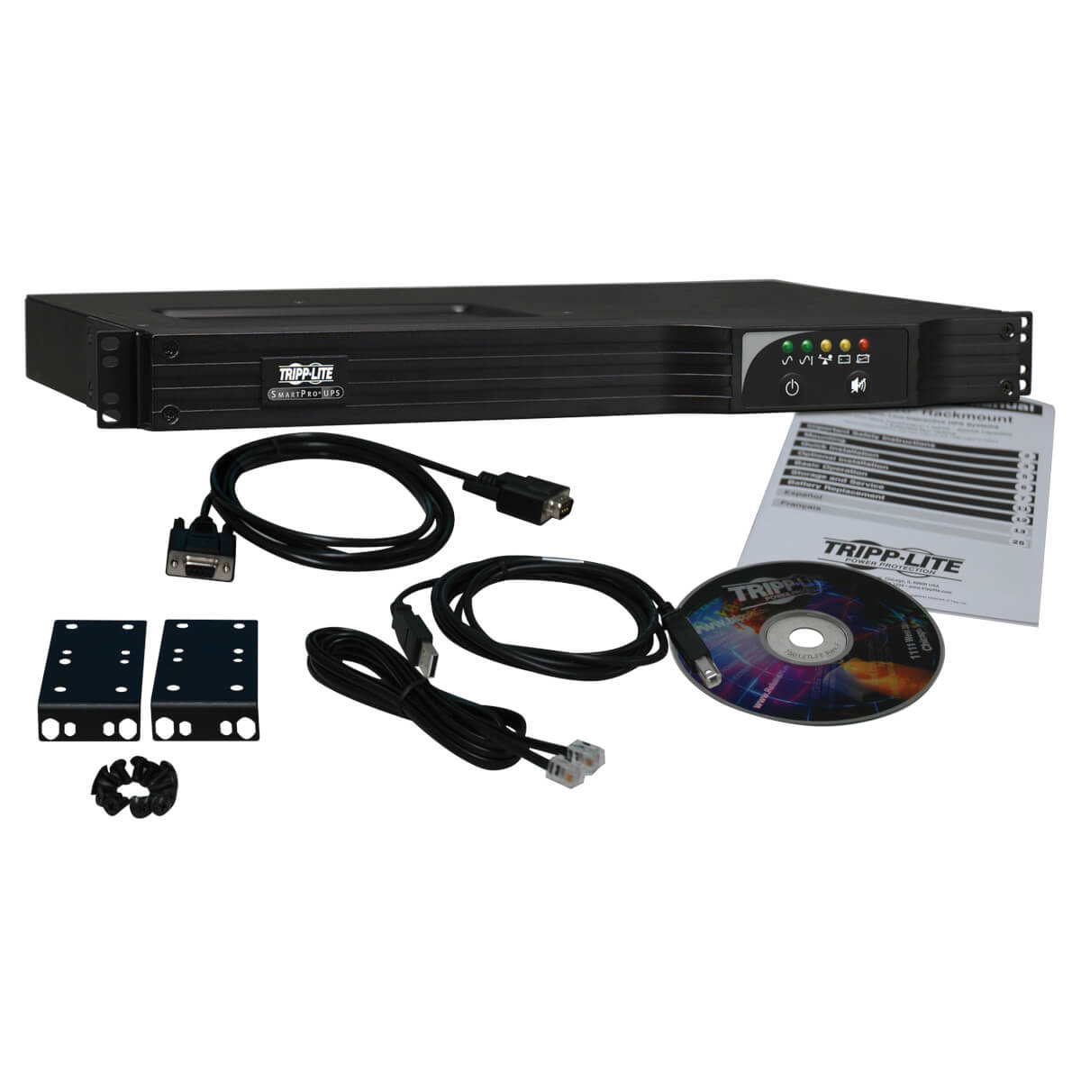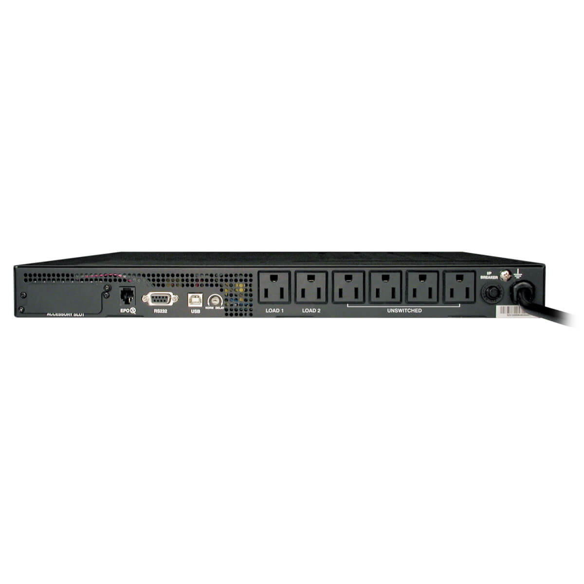 Tripp Lite's SM1000RM1UTAA is compliant with the Federal Trade Agreements Act (TAA) for GSA Schedule purchases. This intelligent, line-interactive sine wave rack/tower uninterruptible power supply prevents data loss, downtime and equipment damage due to power outages, voltage fluctuations and transient surges. Requires only two rack spaces (1U) in a standard rack enclosure. Large internal batteries offer 17 minutes half load runtime and 7 minutes at full load. Maintains regulated 120V nominal output without using battery power during brownouts and overvoltages from 83 to 147V. 1000VA/700 watt power handling capability and full time sine wave output supports networking, telecom and other sensitive electronic applications. Includes a total of 6 outlets arranged in 2 load banks that are individually controllable via software interface to reboot select equipment on demand or shed less significant loads to extend battery runtime for more critical equipment. Supports simultaneous remote monitoring of UPS and site power conditions via built-in network accessory card slot, USB and DB9 serial monitoring ports. Optional SNMPWEBCARD accessory enables remote monitoring of UPS as a managed device via network management console applications. Communications ports support messaging of detailed UPS operating parameters and line power status. Includes PowerAlert UPS monitoring and unattended shutdown software with management support for an unlimited number of network UPS systems. Built-in accessory slot supports SNMP with optional SNMPWEBCARD adapter. Emergency Power Off (EPO) interface offers option for instantaneous power-off of UPS and connected equipment in the case of fire or emergency. Multi-function audible alarms and set of 5 front panel LEDs offer at-a-glance notification of UPS and line power status. Network-grade AC surge suppression protects equipment from damage and performance problems resulting from transient surges and line noise. Attractive all-black color scheme. Two year warranty with $250,000 connected equipment insurance (USA & Canada only).