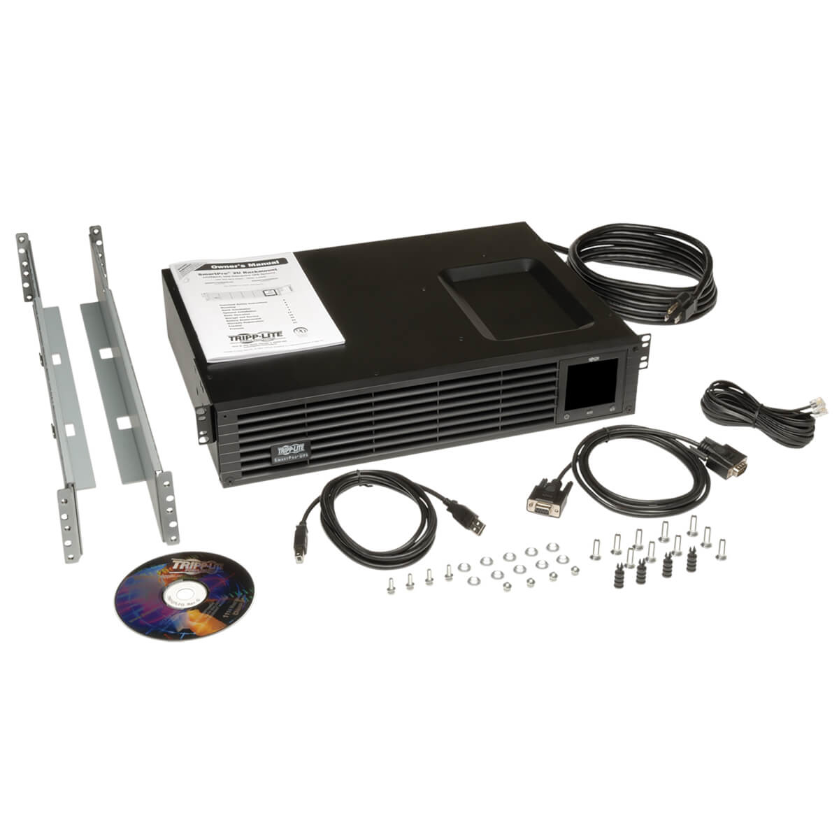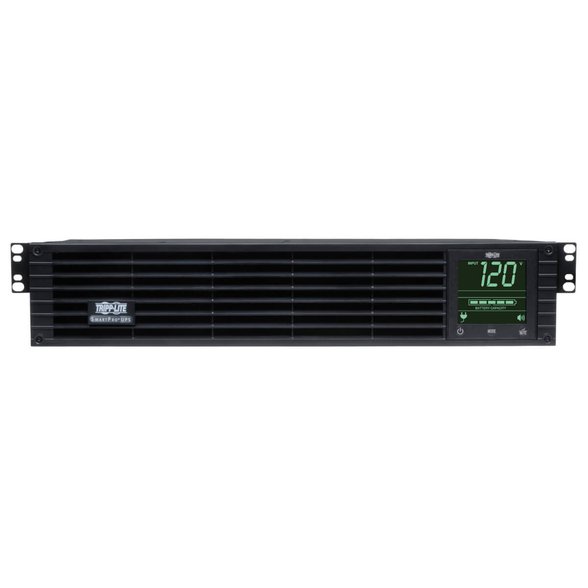Tripp Lite SmartPro Line Interactive UPS with enhanced LCD interface offers network-grade power protection for critical server, network and telecommunications equipment. Line Interactive Uninterruptible Power Supply (UPS) with built-in Auto-Voltage Regulation (AVR) actively corrects brownouts and overvoltages back to usable levels while maintaining a full battery charge in case of power failure. Interactive LCD interface reports UPS operating mode, detailed UPS and site-power data, plus enables a variety of UPS setup and configuration options. Super-fast switchover from line to battery power occurs within milliseconds to maintain operation of connected equipment without interruption or reboot. 95% line-mode efficiency offers reduced heat emissions and operating costs. Network management interfaces support communications via USB, RS-232 and optional SNMPWEBCARD network interface. HID-compliant USB port enables integration with built-in power management and auto shutdown features of Windows and Mac OS X. Network communications ports enable detailed monitoring of equipment load levels, self-test data and utility power conditions. Includes PowerAlert monitoring software and complete cabling. Switched output load banks enable scheduled and real-time remote reboot and load shedding of select outlets. Emergency Power Off (EPO) interface. LCD display panel easily rotates for viewing in rackmount or tower configurations. Audible alarm with push-button momentary alarm-cancel and silent-mode configuration options. Programmable self-test. Field-replaceable, hot-swappable battery modules.