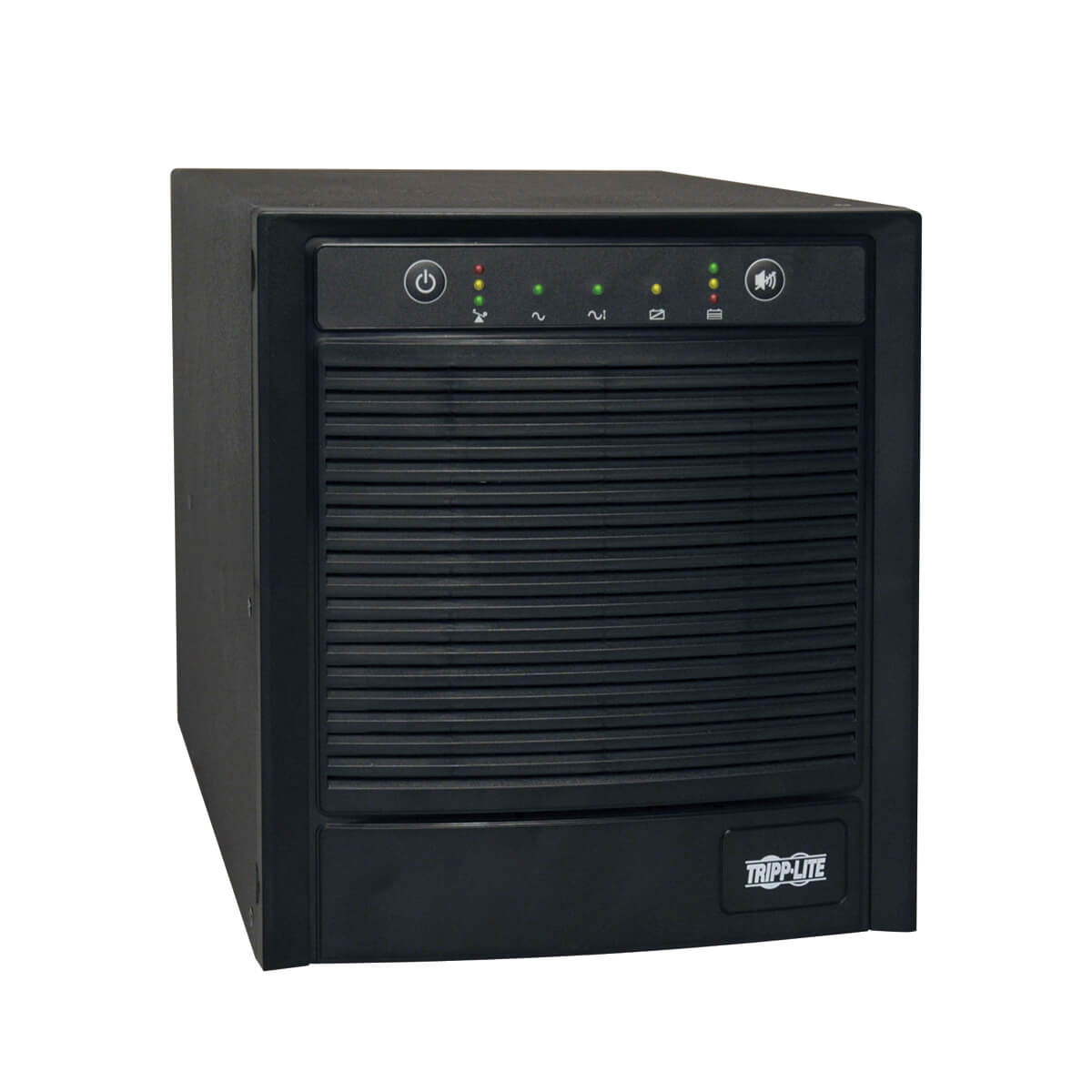 3000VA line-interactive tower UPS system for server, networking and telecommunications equipment. Upright tower form factor. Offers sine wave 120V nominal output in both AC and battery modes. Switches to battery-derived AC output during power failures and extreme voltage variations. Line-interactive automatic voltage regulation (AVR) provides voltage boost/cut during brownouts/overvoltages to maintain regulated 120V nominal output over an input voltage range of 83-145V. Includes NEMA L5-30P input plug and 7 UPS-supported output receptacles (6 x 5-15/20R, 1 x L5-30R). Network-grade AC surge and noise suppression. Network management interfaces support simultaneous communications via USB port, DB9 serial port and SNMPWEBCARD slot. HID-compliant USB interface enables integration with built-in power management and auto shutdown features of Windows and Mac OS X. Supports simultaneous detailed monitoring of equipment load levels, self-test data and utility power conditions via all three network interfaces. Includes PowerAlert power management software and complete cabling. Three-stage metered current monitoring and battery charge status LEDs. Utility power and voltage regulation, and battery warning LEDs. Audible alarm. Self-test. Field-replaceable, hot-swappable internal batteries. Attractive all-black color scheme.
