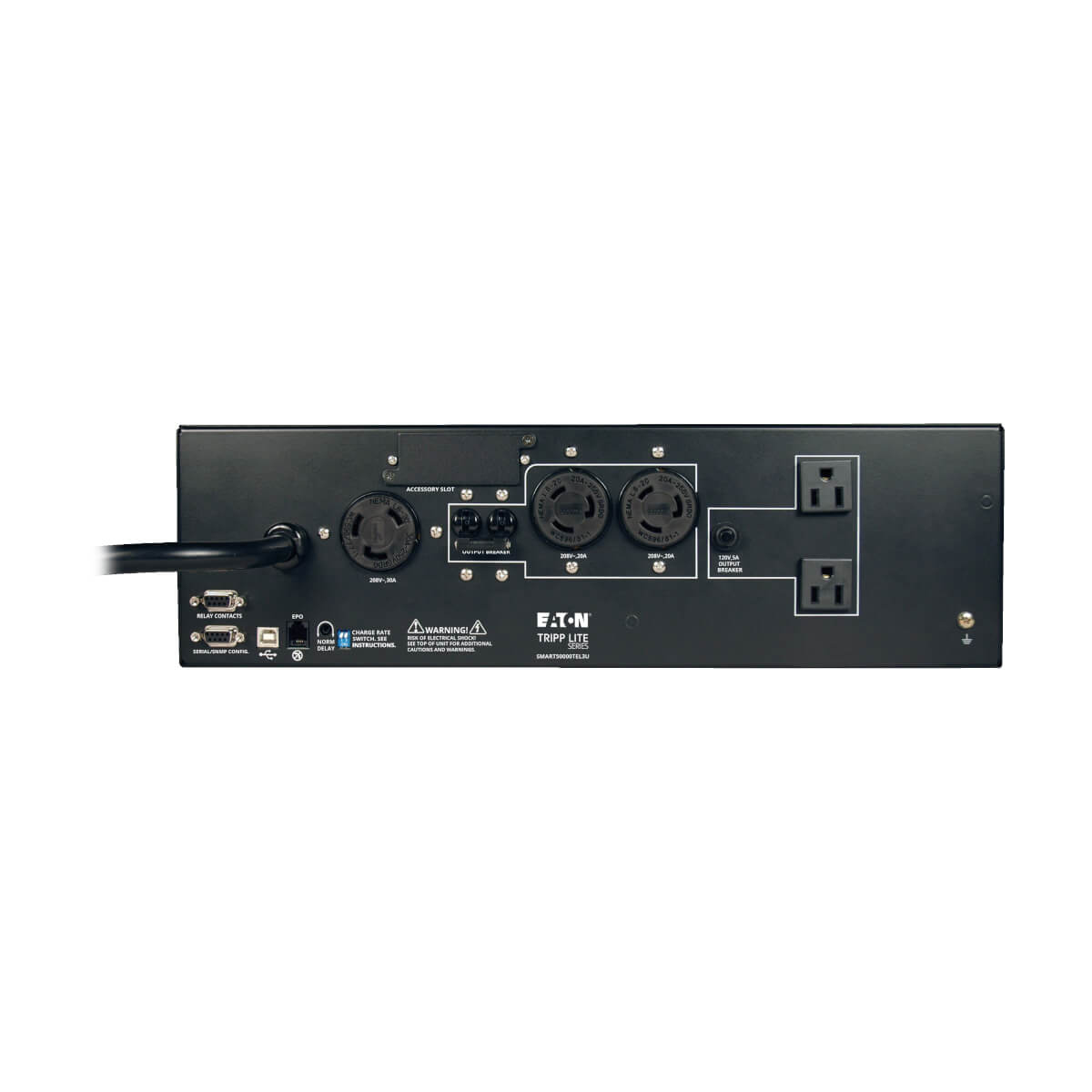 Tripp Lite's SMART5000TEL3U intelligent, line interactive UPS protects server, networking and telecommunications equipment from blackouts, voltage fluctuations and surges in a compact rackmount housing. Completely self-contained UPS system occupies only 3 rack spaces (3U) in a standard 19 inch rack, making this model one of the smallest 5kVA UPS systems available. Included accessories support mounting 4 post rack enclosures. Large capacity 5000 VA/3750 watt UPS system accepts raw AC input, adjusting output to regulated 208V levels. One pair of 120V outlets support up to 600VA monitors and other low voltage accessories. Includes slot for internal SNMP/web card, plus 2 DB9 and 2 USB enhanced monitoring ports for unattended shutdown, remote control and monitoring of UPS system and power data. Five outlets (two L6-20R, one L6-30R and two 5-15R) allow the connection of high current 20 and 30 amp 208V connectors and up to two 120V devices (max 600VA at 120V).