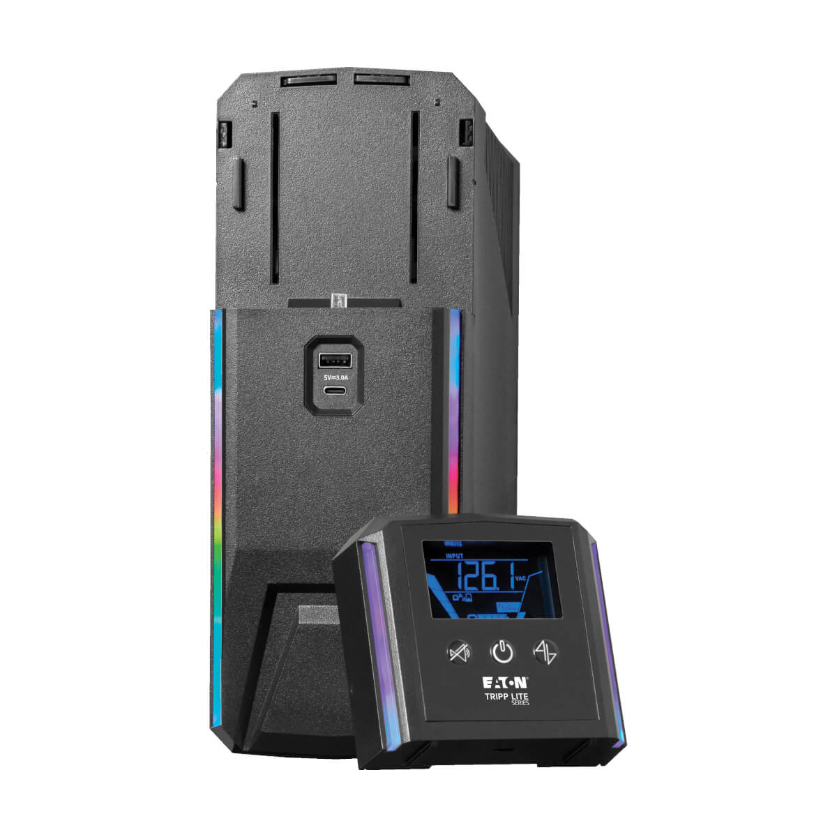 The SMART600PSGLCD is purpose-built for gaming, including RGB color LEDs you can program yourself. Controllable via the detachable front-panel LCD or Tripp Lite’s free downloadable software utility (https://www.tripplite.com/products/management-utilities), two separate LED banks come with seven preset lighting modes and 16.7 million possible color combinations. You can program a variety of color and motion effects or configure the lights to respond to power consumption changes on the master outlet.