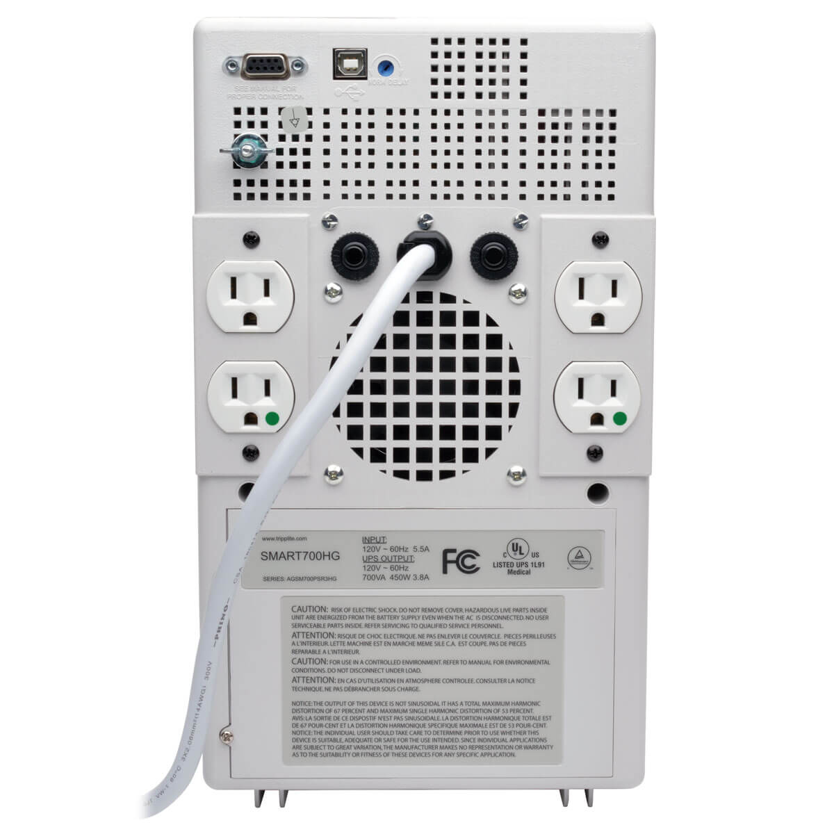 Tripp Lite SMART700HG. Output power capacity: 0.75 kVA, Output power: 450 W, Surge energy rating: 480 J. Typical backup time at full load: 18 min, Typical backup time at half load: 42 min, Battery recharge time: 4 h. Form factor: Tower, Product color: White, Cable length: 70.9" (1.8 m). Certification: CE, GOST, SASO, FCC Part 15 Category A, ROHS. Width: 7.5" (190.5 mm), Depth: 9.5" (241.3 mm), Height: 12.5" (317.5 mm)