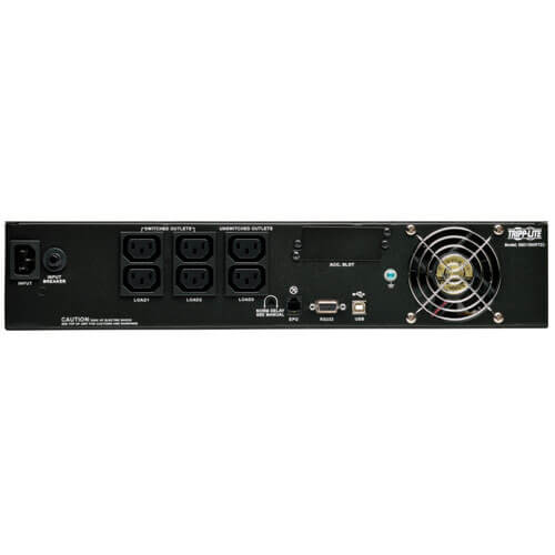 Featuring six C13 outlets (four switchable) and a C14 inlet that accepts a user-supplied AC power cord, the SMX1000RT2U has an internal battery that provides 11.9 minutes of support at half load and 3.6 minutes at full load. A front-panel LCD screen lets you configure settings and monitor important data, such as load level, voltage, battery charge and estimated runtimes.