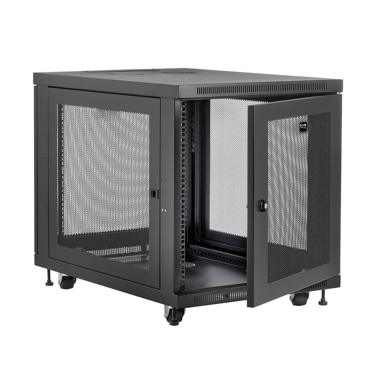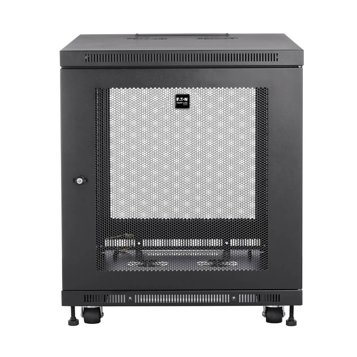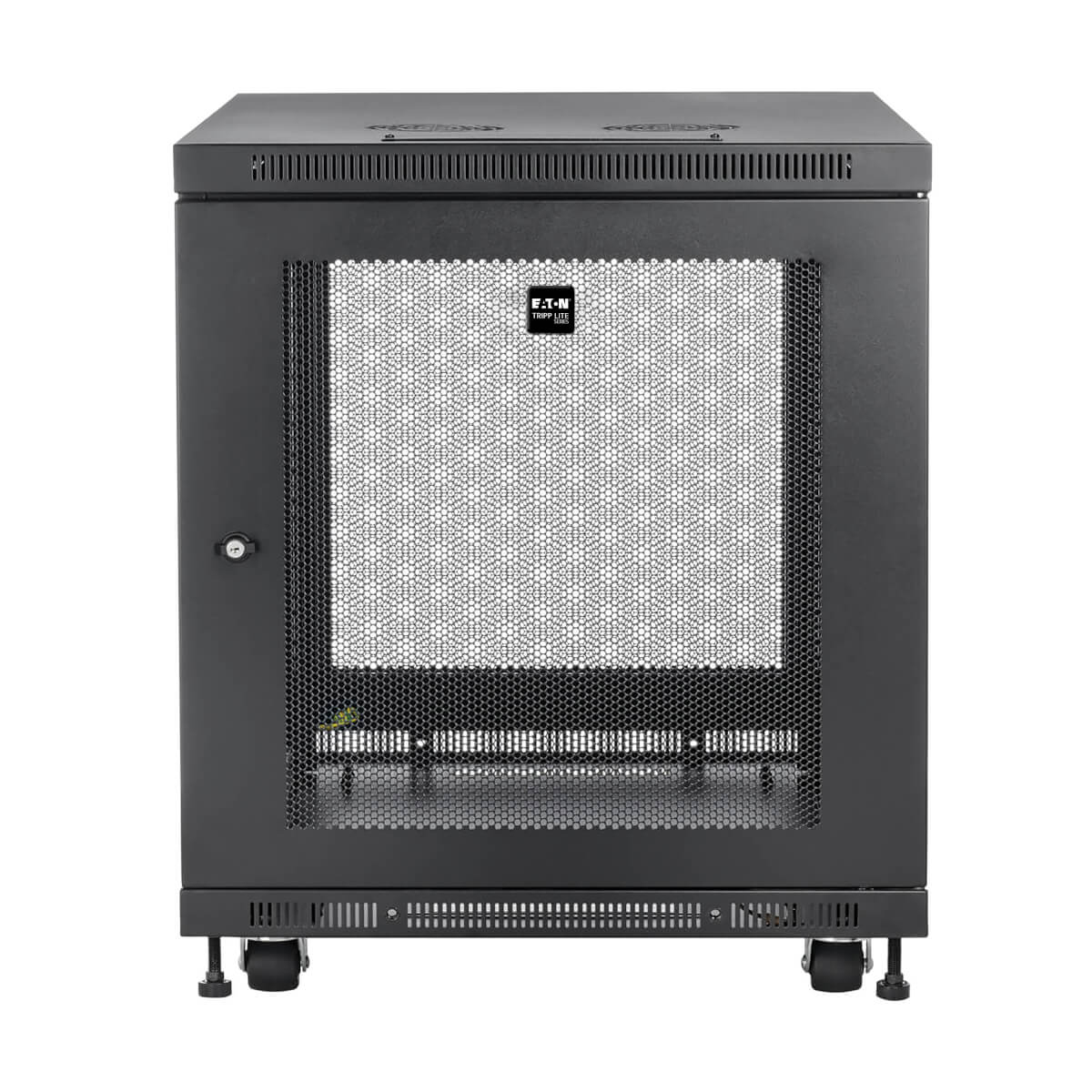 This SmartRack® 12U Mid-Depth Rack Enclosure Cabinet is designed to simplify rack equipment installations and rack equipment maintenance. Compatible with all standard 19-inch rack equipment, it features front and rear pairs of vertical rails with square mounting holes. The rails are adjustable in quarter-inch increments to accommodate equipment depths from three to 32.5 inches, ideal for standard server installation. The rails are capable of supporting up to 1,000 pounds (453.6 kilograms) of equipment. The top and bottom panels are provided with ports for cable routing, and are furnished with vents designed to help remove warm air from the enclosure and draw in cool air by convection. The panels also support installation of standard user-supplied case fans (SRFANWM, sold separately). With a locking reversible front/rear doors and locking removable side panels, the SR12UB provides for the safe, secure installation of all equipment. To simplify deployment, the SR12UB comes with an accessory caster kit so it can easily be maneuvered into the desired location, and then secured in place by adjusting the unit's levelers. It ships fully assembled for quick installation.