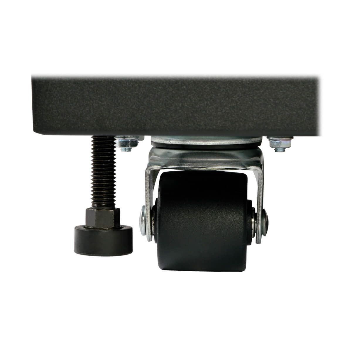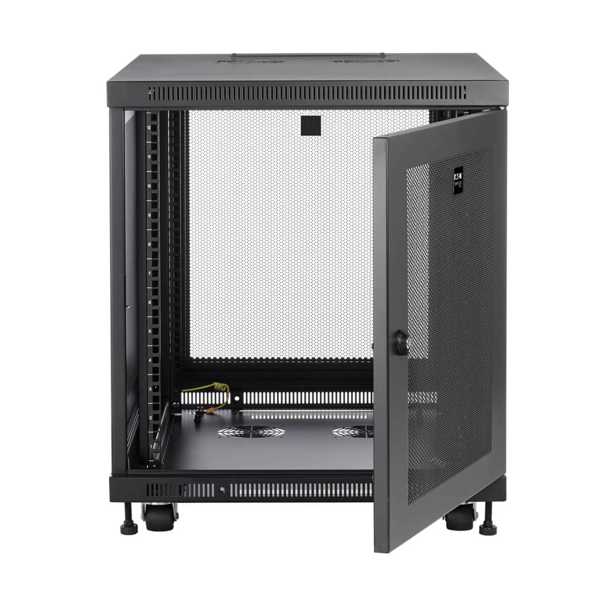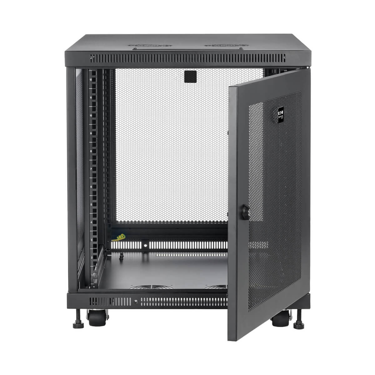 This SmartRack® 12U Mid-Depth Rack Enclosure Cabinet is designed to simplify rack equipment installations and rack equipment maintenance. Compatible with all standard 19-inch rack equipment, it features front and rear pairs of vertical rails with square mounting holes. The rails are adjustable in quarter-inch increments to accommodate equipment depths from three to 32.5 inches, ideal for standard server installation. The rails are capable of supporting up to 1,000 pounds (453.6 kilograms) of equipment. The top and bottom panels are provided with ports for cable routing, and are furnished with vents designed to help remove warm air from the enclosure and draw in cool air by convection. The panels also support installation of standard user-supplied case fans (SRFANWM, sold separately). With a locking reversible front/rear doors and locking removable side panels, the SR12UB provides for the safe, secure installation of all equipment. To simplify deployment, the SR12UB comes with an accessory caster kit so it can easily be maneuvered into the desired location, and then secured in place by adjusting the unit's levelers. It ships fully assembled for quick installation.