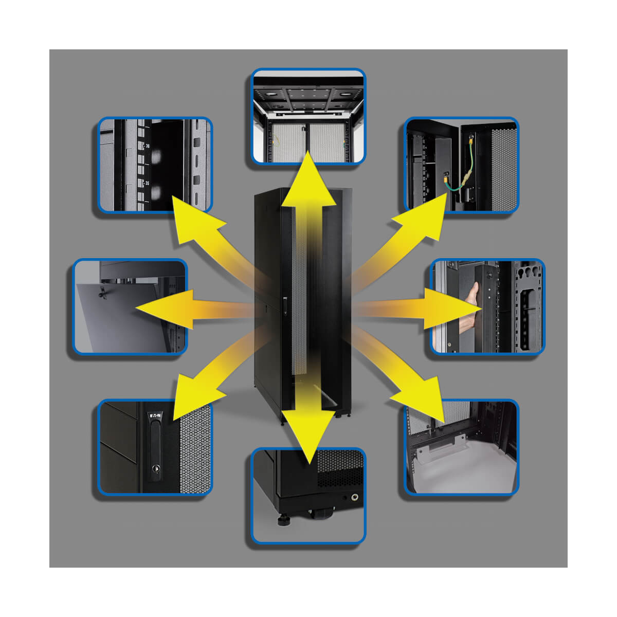 The reversible front and back doors and removable side panels lock securely with the included keys to help prevent damage, tampering or theft. The doors and side panels are designed for quick release, making it simple to access connected equipment and cabling with little effort. Convenient top access ports and an open bottom allow easy cable routing through the cabinet. The vented doors allow generous airflow from front to rear to keep your equipment cool and functioning at its peak.