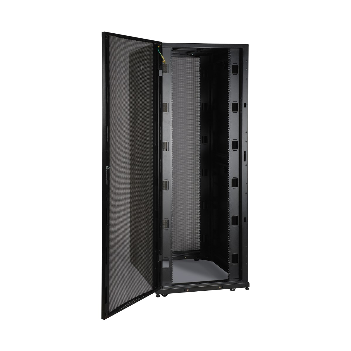 The SR42UBWDSP1 houses 3,500 pounds (1588 kilograms) of standard 19-inch rack equipment in 42U. Its front and rear pairs of vertical rails have square mounting holes that are adjustable in quarter-inch increments from four to 42 inches. Adjustment is quick and an easy-view depth index ensures consistent rail placement without requiring time-consuming measurements. Each rack space within the enclosure is numbered for ready reference.