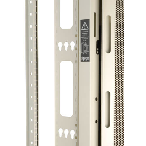 The SR42UWEXP houses 3000 lbs (1360.8 kgs) of standard 19-inch rack equipment in 42U. Offers vendor-neutral square hole/cage nut mounting for guaranteed compatibility with all EIA-310-E compliant 19" equipment. Its front and rear pairs of vertical rails are adjustable in quarter-inch increments from 4 to 37 inches. Adjustment is quick and an easy-view depth index ensures consistent rail placement without requiring time-consuming measurements. Each rack space within the enclosure is numbered for ready reference. Two of these adjustable vertical mounting rails support toolless button-mount 0U installation of up to four compatible PDUs and cable managers. This feature makes it easier to route cabling to rack equipment and reduces cord clutter.