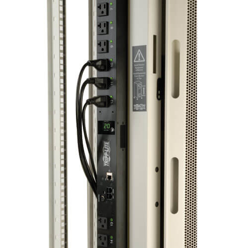 Toolless accessory mounting rails (2 rails per enclosure) include slots for quick installation of compatible PDUs and vertical cable managers. Mounting slots are arranged in an industry-standard pattern compatible with a wide variety of accessories. Each rail can accommodate two vertical PDUs or cable managers side-by-side (four items per enclosure).