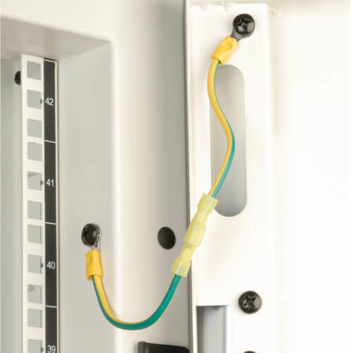 All components of the SR42UWEXP are grounded to the enclosure frame. Front and rear threaded grounding points are provided for connection to the facility earth ground. The removable front and rear doors feature quick-release ground wires.