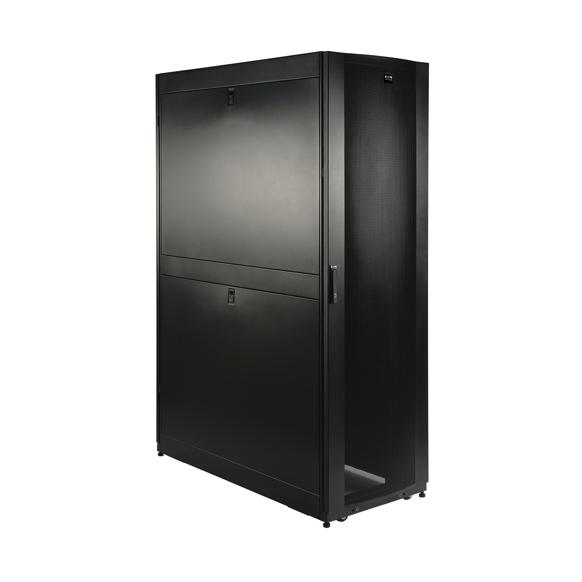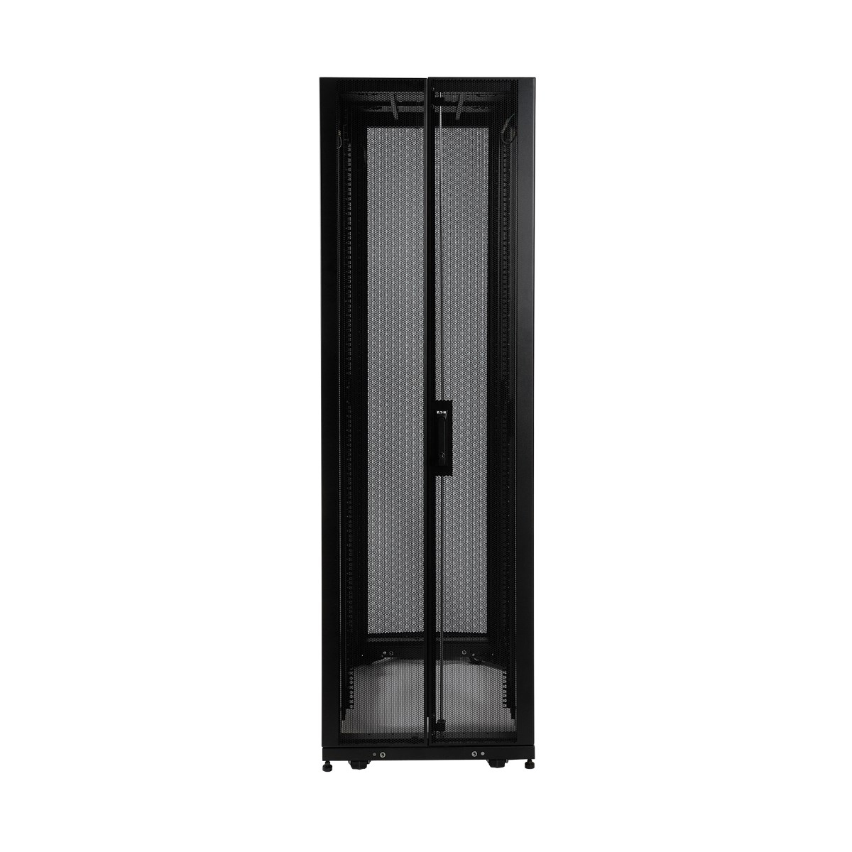 It houses 3,500 pounds (1588 kilograms) of standard 19-inch rack equipment in 45U. To simplify deployment, the SR45UBDP comes with preinstalled casters that enable it to be easily maneuvered into the desired location, where it can be secured by adjusting the preinstalled levelers. Note: The casters are intended for minor position adjustments and are not designed for moving the enclosure over long distances.