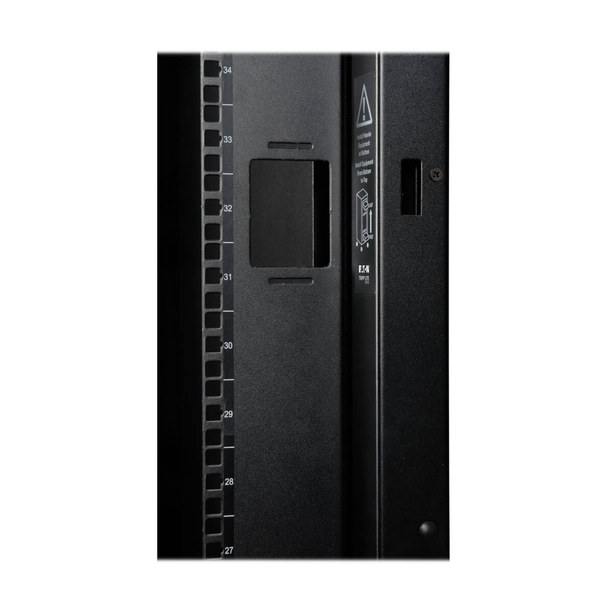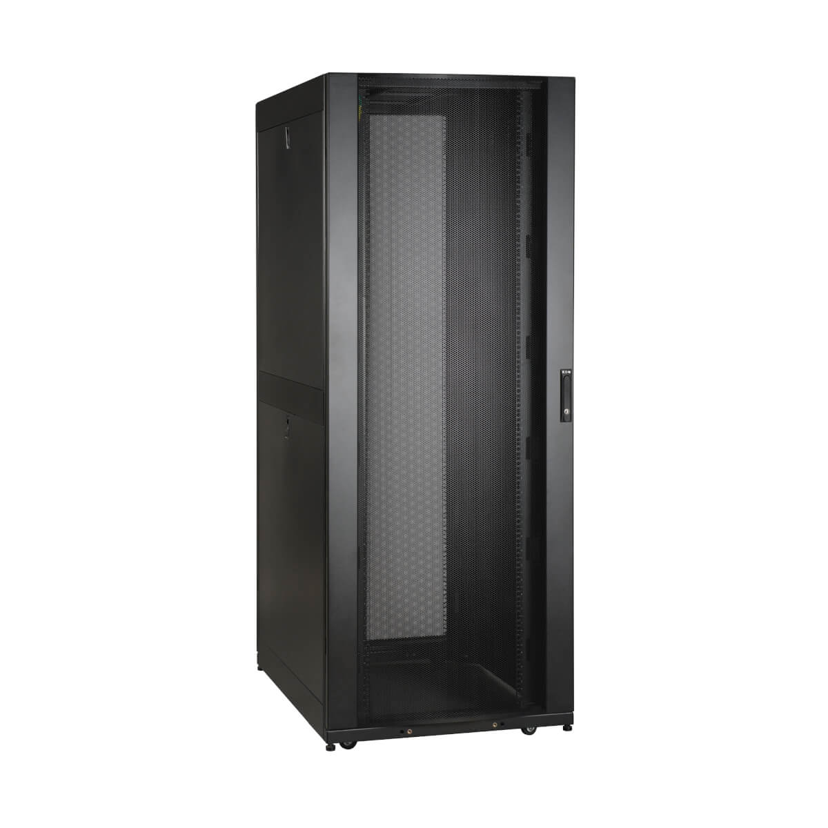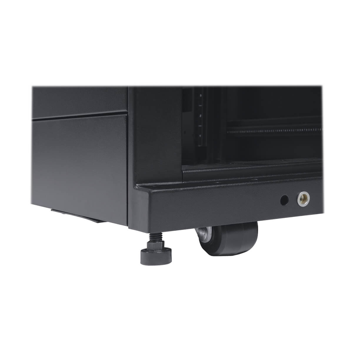 It houses 3,500 pounds (1588 kilograms) of standard 19-inch rack equipment in 45U. To simplify deployment, the SR45UBWD comes with preinstalled casters that enable it to be easily maneuvered into the desired location, where it can be secured by adjusting the preinstalled levelers. Note: The casters are intended for minor position adjustments and are not designed for moving the enclosure over long distances.