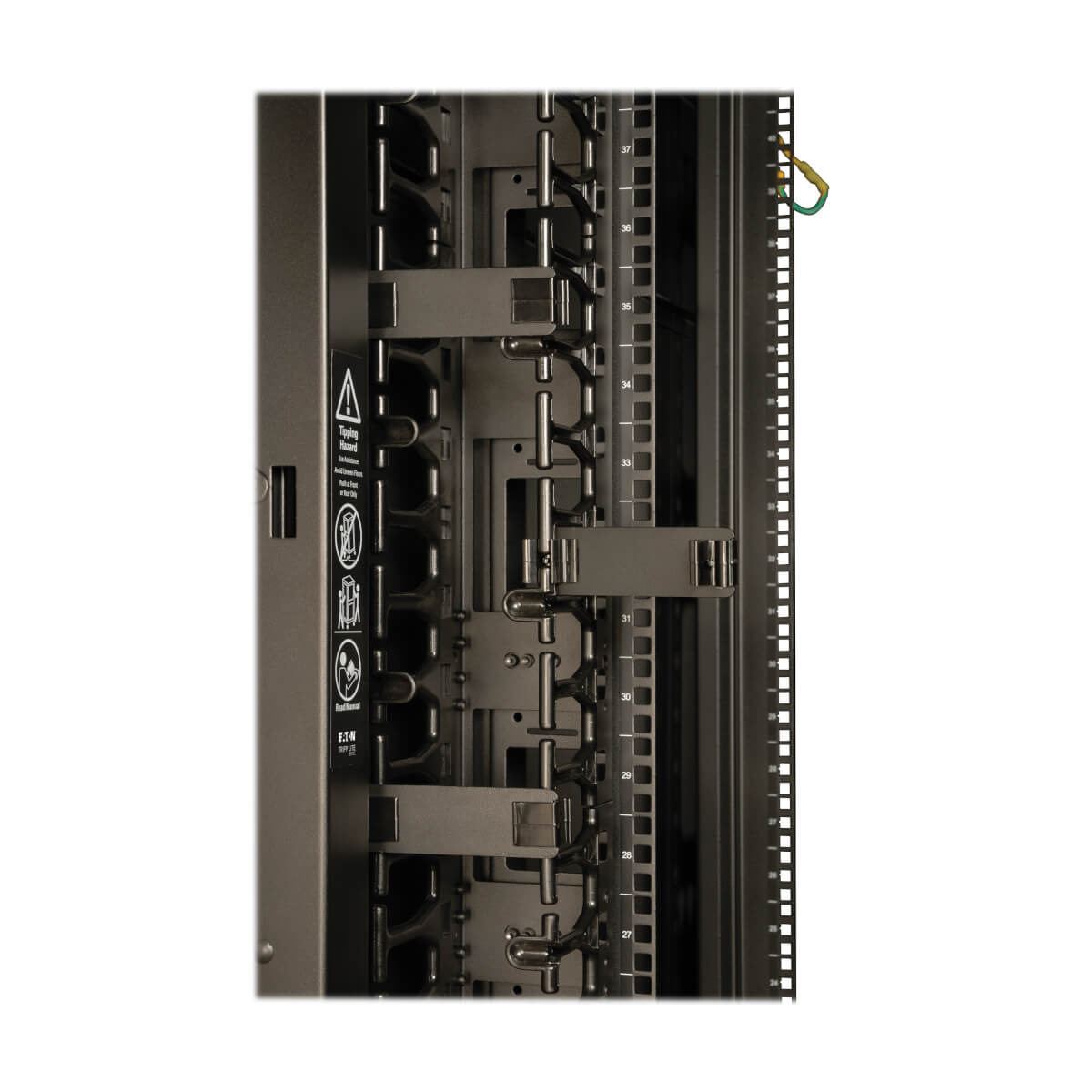 SR45UBWDVRT is a wider version of the standard 45U SmartRack® enclosure (750 mm wide compared to the standard 600 mm wide) and includes two SRCABLEVRT3 six-foot (1.8-meter) vertical cable managers. SRCABLEVRT3 helps eliminate cable stress by organizing the cables within the enclosure. The vertical cable managers are 6 feet high and 3 inches wide.