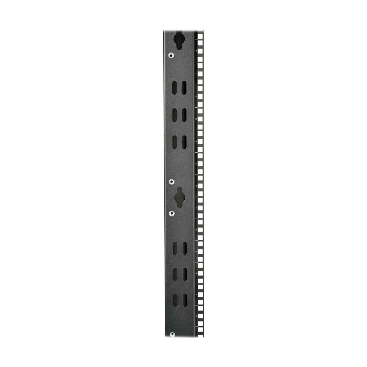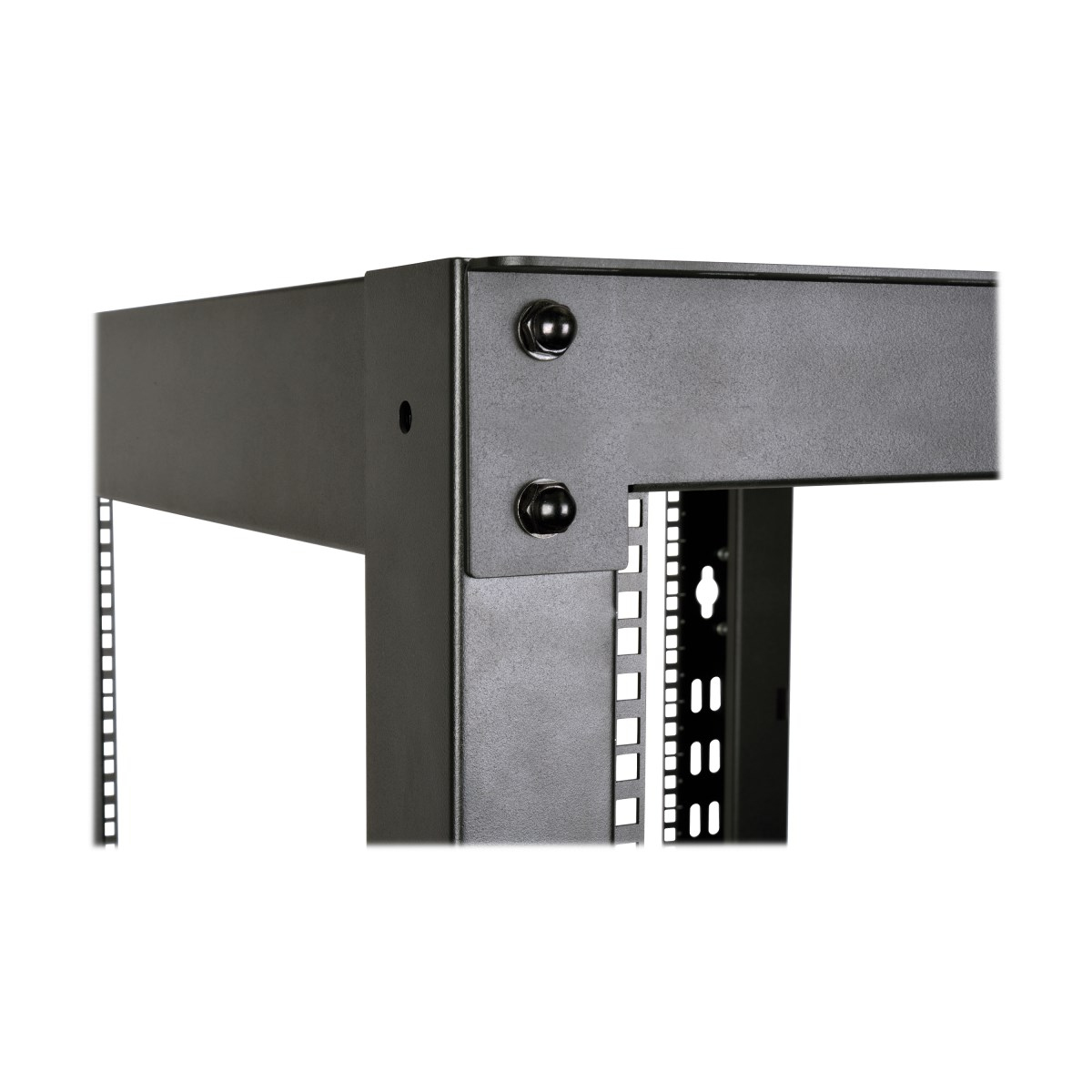 The open design of the SR4POST50HD provides unobstructed airflow and easy access to equipment and cabling. It has numbered, square-hole mounting positions for easy installation of standard 19-inch rack equipment. The SR4POST50HD supports equipment depths up to 35 inches. This rack also accommodates toolless button-hole mounting for vertical PDUs and cable managers.