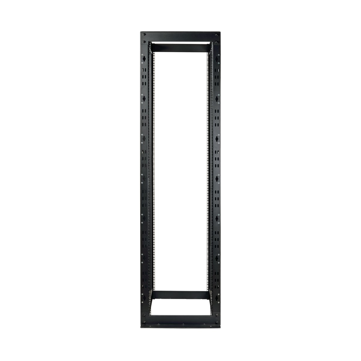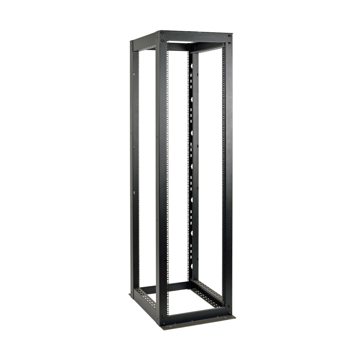 This 50U Heavy-Duty 4-Post Open Frame Rack helps IT managers organize their equipment array and provides fast, easy access to installed IT equipment. The SR4POST50HD is a simple solution for housing IT equipment in secure environments and other areas that don't require a lockable rack solution. This 50U rack features heavy-duty cold-rolled steel construction with a black powder-coated finish for durability. It supports stationary loads up to 3,000 pounds (1360.8 kilograms). The SR4POST50HD comes with all the hardware required for assembly and has a self-squaring design with bolt-down provisions. For high-density applications, multiple units can be bolted together side by side.