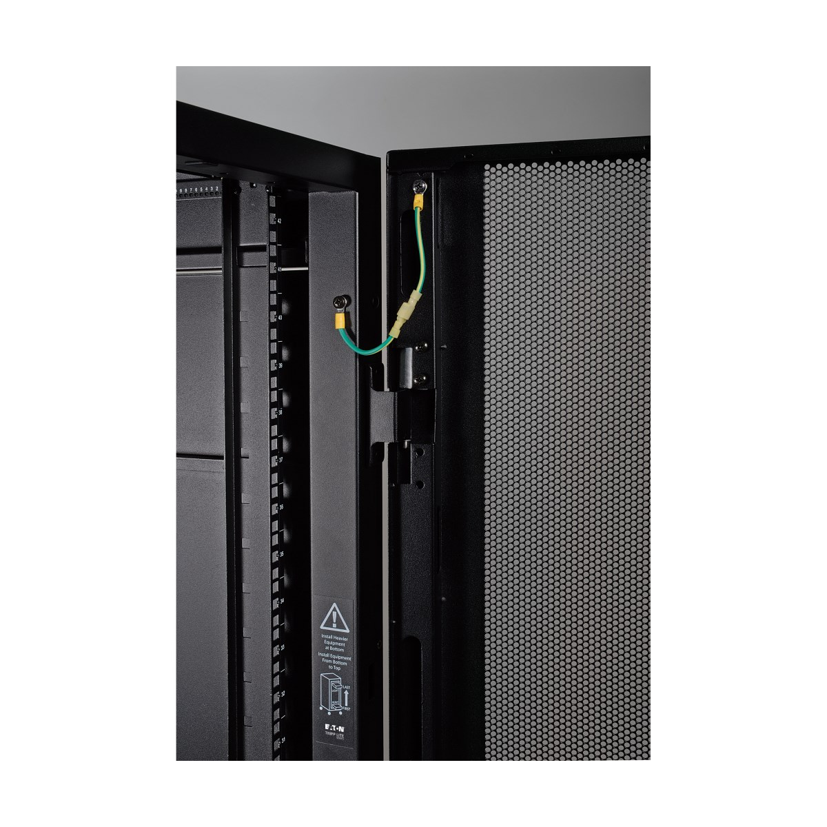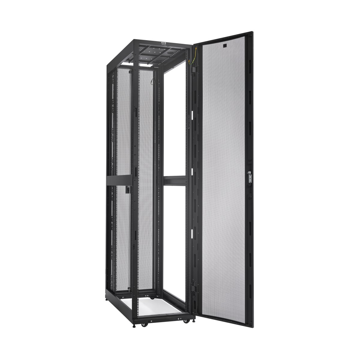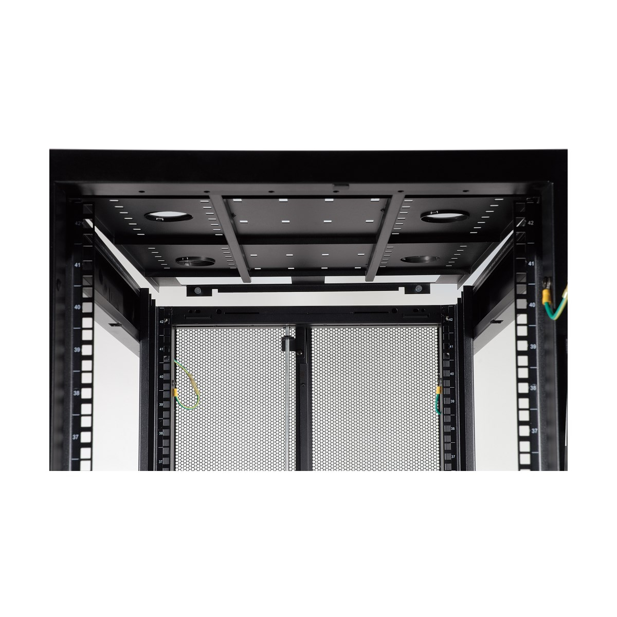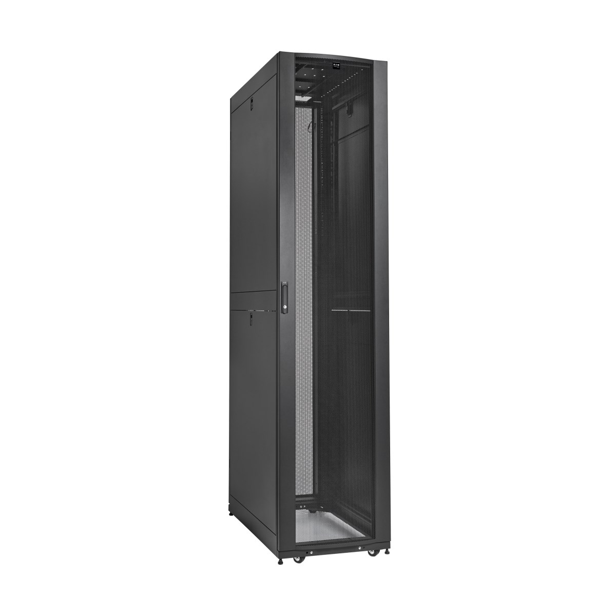 The reversible front door, split rear doors and half-size side panels lock securely to help prevent damage, tampering or theft. The doors, side panels and top panel are designed for quick release, making it easy to access connected equipment and cabling with little effort. Convenient top access ports and an open bottom allow easy cable routing through the cabinet. The vented doors allow generous airflow (more than 65% open space) from front to rear to keep your equipment cool and functioning at their peak.