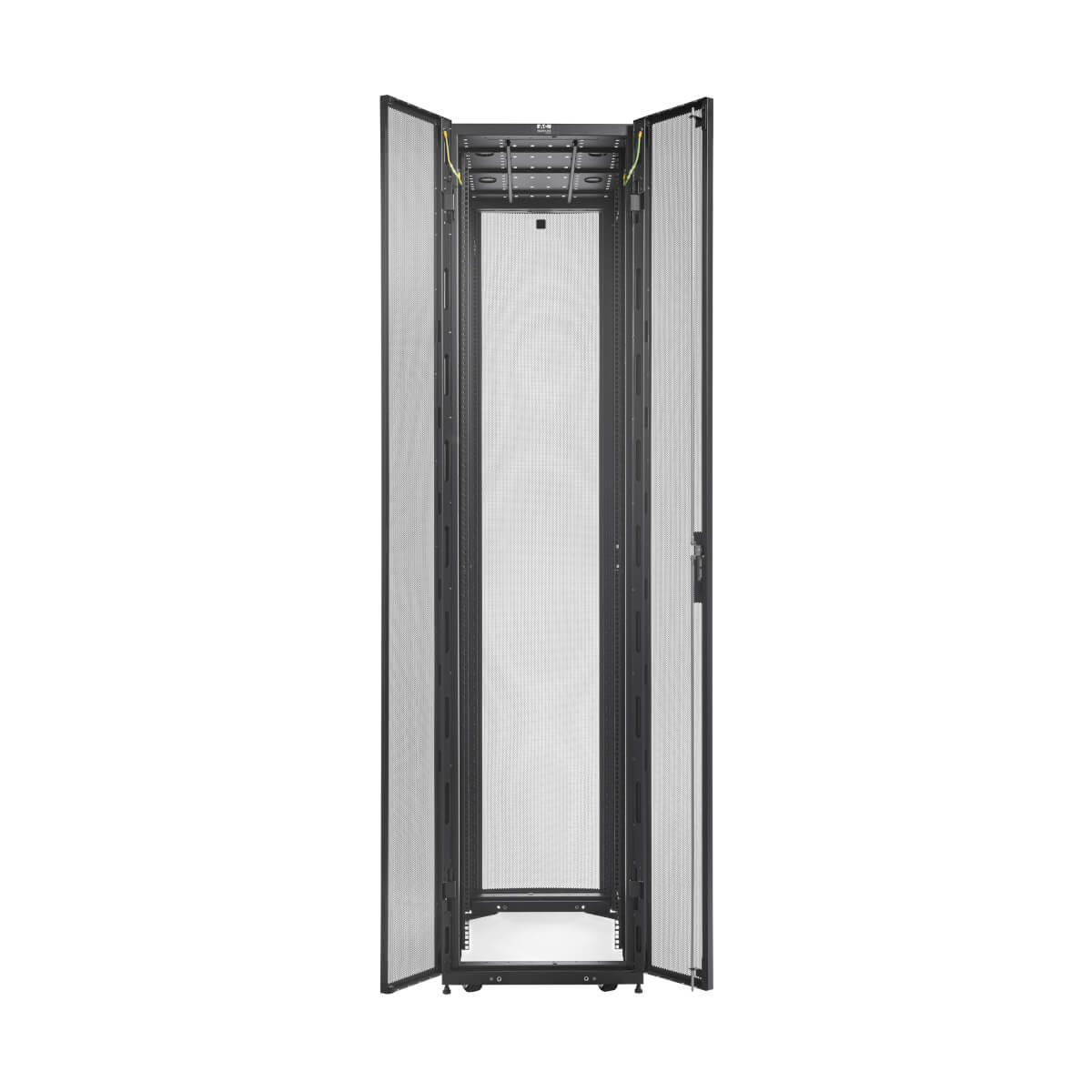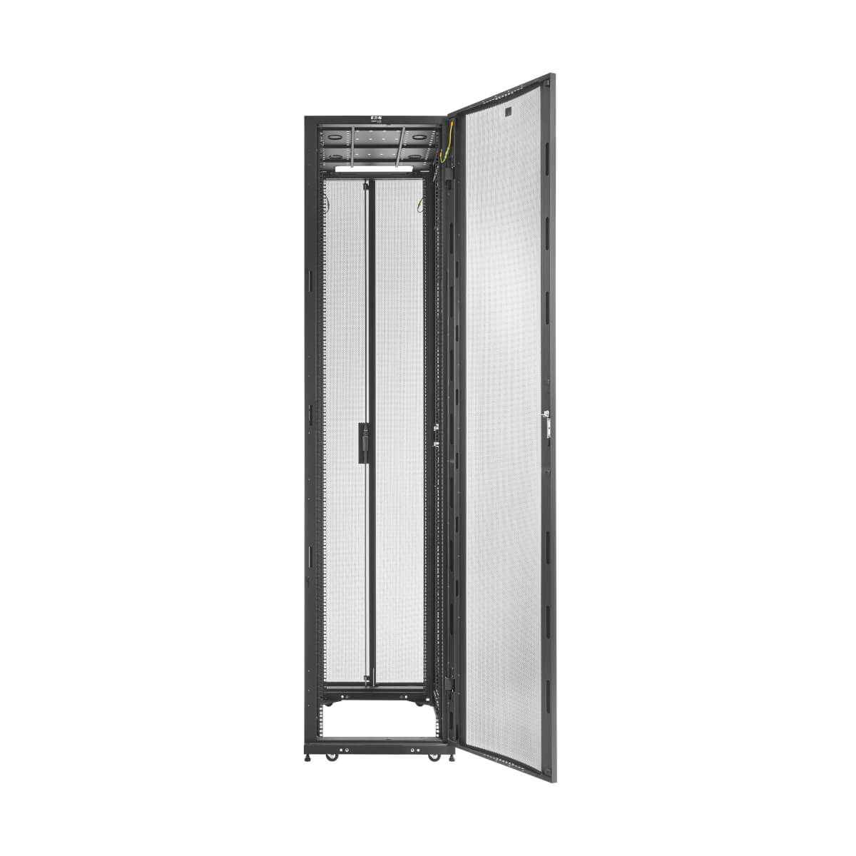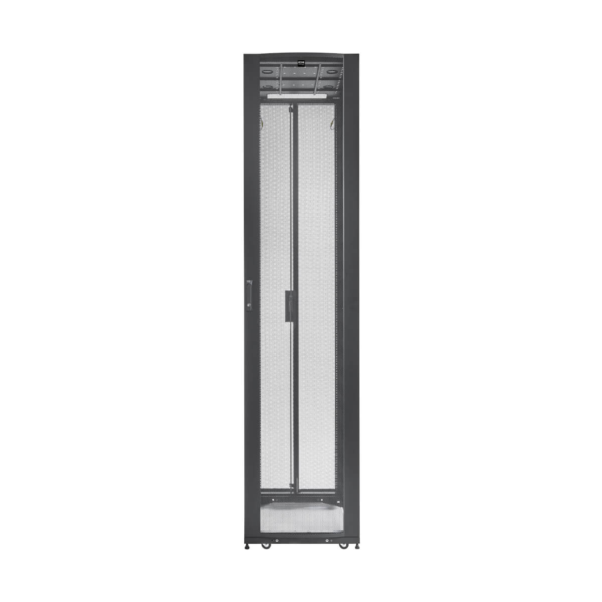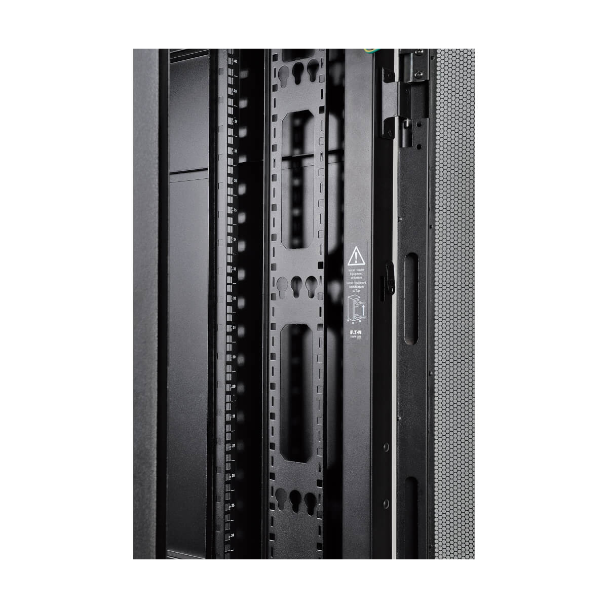 This 52U server rack comes fully assembled for quick and easy deployment with pre-installed (and removable) casters that let you maneuver it over a level, smooth, stable surface and through a standard seven-foot (2.1-meter) doorway into position, where it can be stabilized by adjusting the levelers (also removable). Front and rear mounting rails accept standard rack equipment up to 37 inches (940 millimeters) deep. Toolless 0U mounting rails allow quick installation of up to four compatible PDUs and vertical cable managers.