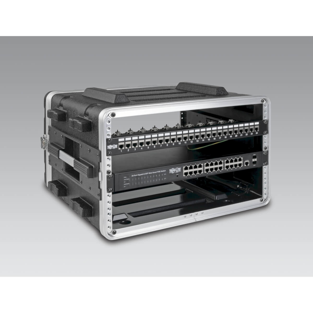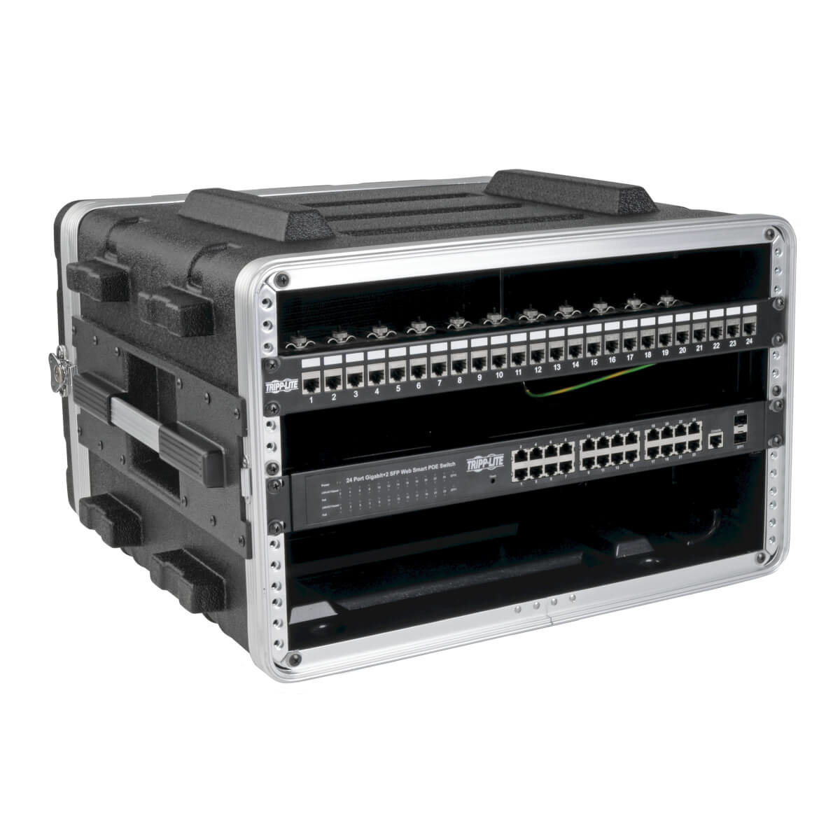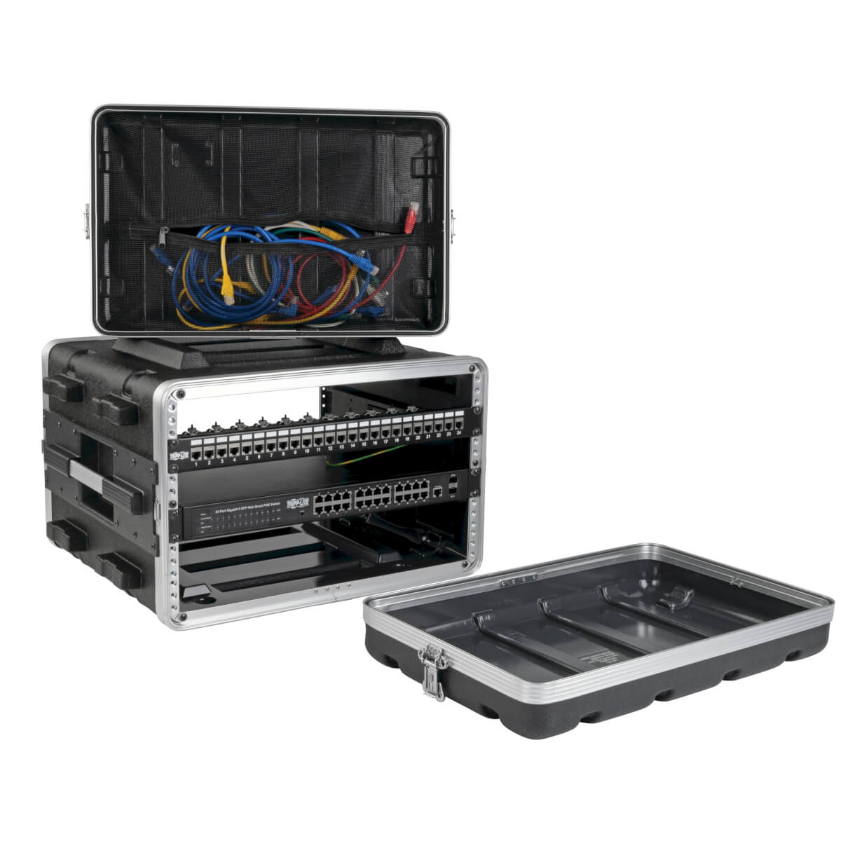 This SmartRack® 6U ABS flight case houses EIA-standard 19-inch rack equipment while it's being moved from one location to another. Constructed from heavy-duty ABS, the SRCASE6U features four stationary mounting rails that support up to 6U of servers, switches, patch panels, UPS systems and other rack components up to 20.5 inches deep. Maximum load capacity is 100 lbs (45.4 kgs). The case is ideal for transporting sensitive rack equipment to trade shows or other facilities without fear of damage.