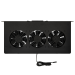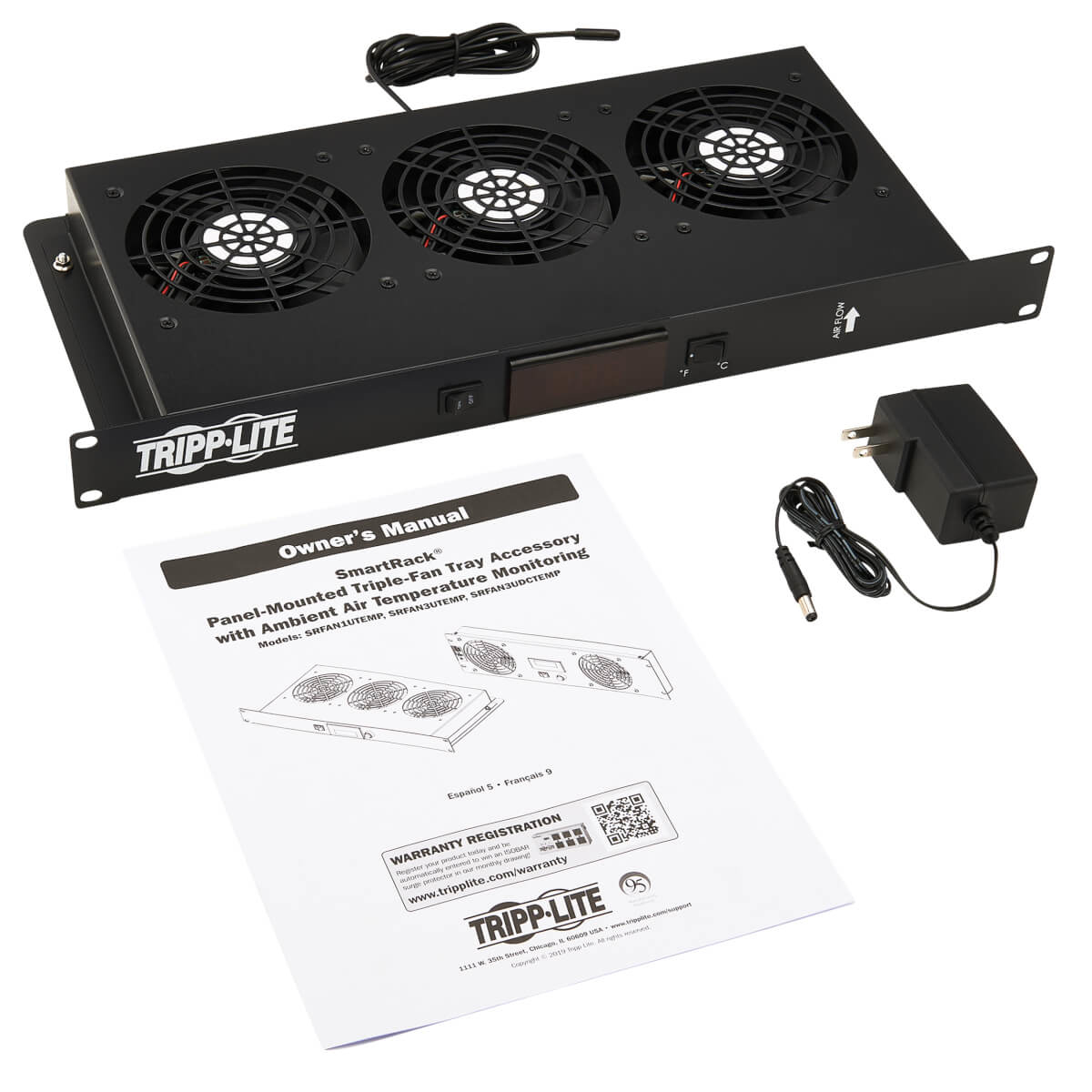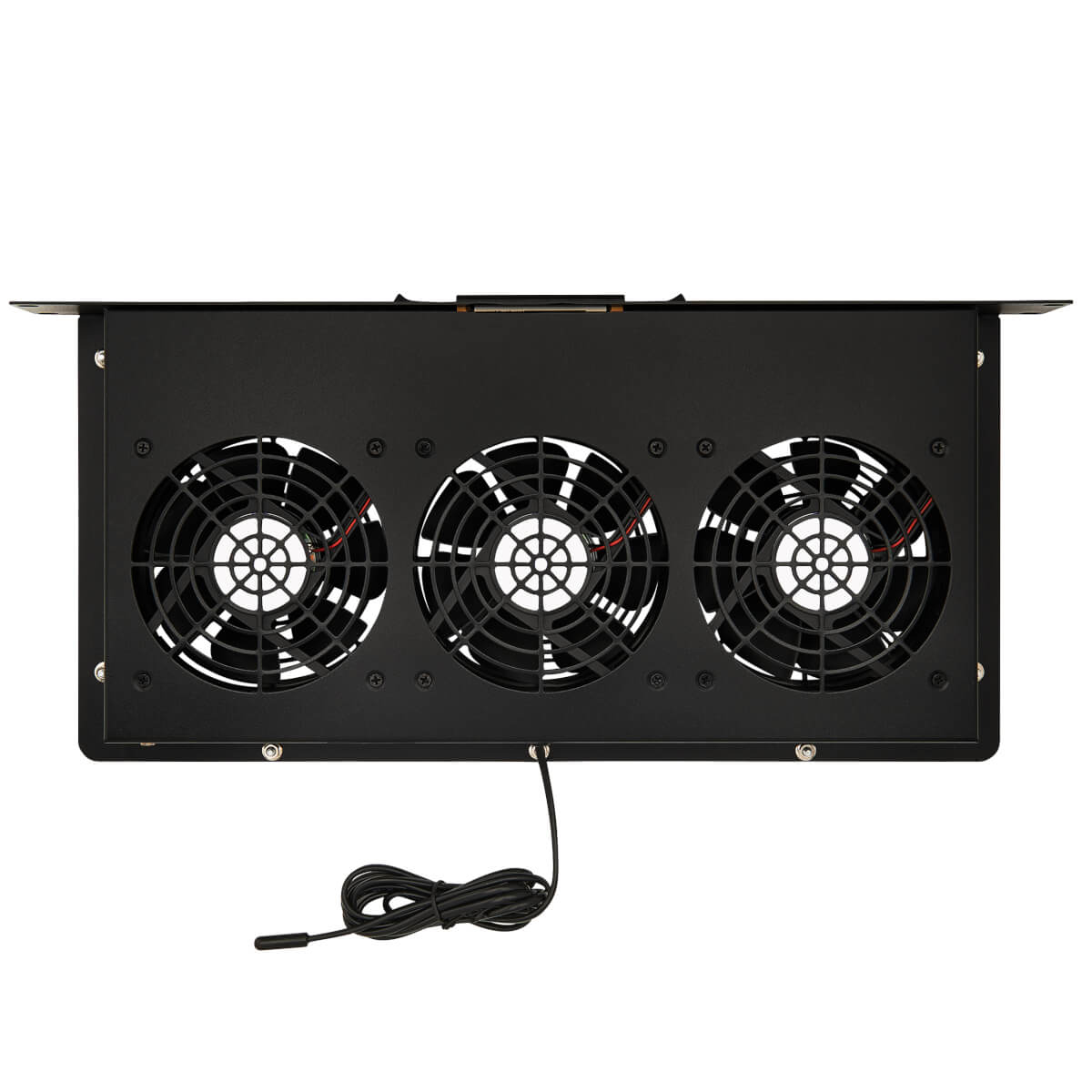 Three built-in four-inch 12VDC fans mount into the rack and pull cool air from the outside. The included 12V DC power supply features a 6-ft. (1.83 m) cord and NEMA 1-15P plug that connects to an AC wall outlet, PDU or UPS system.
