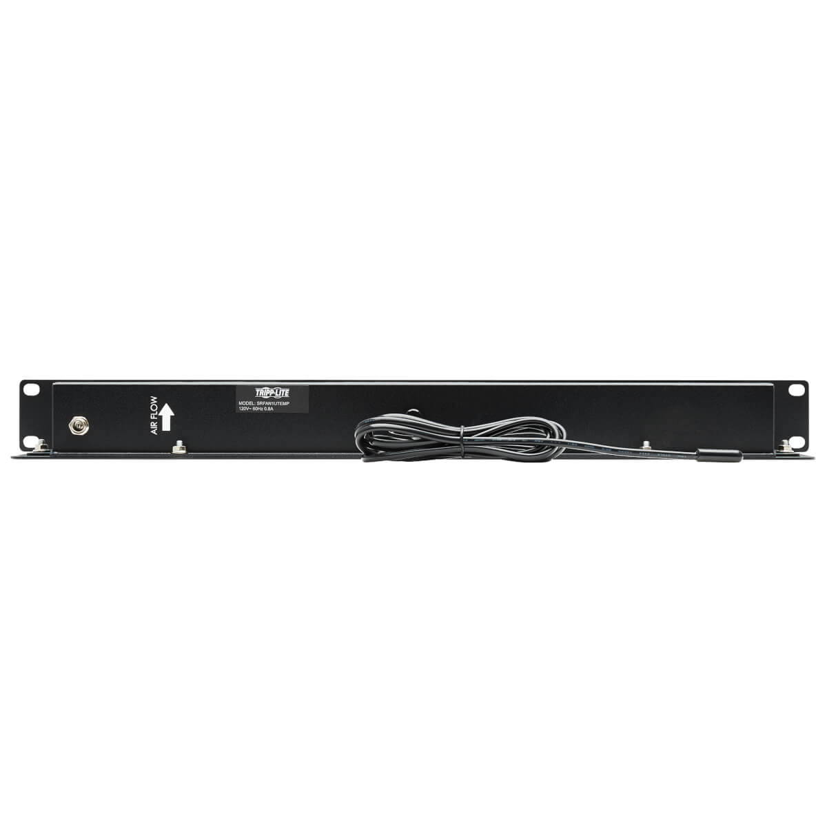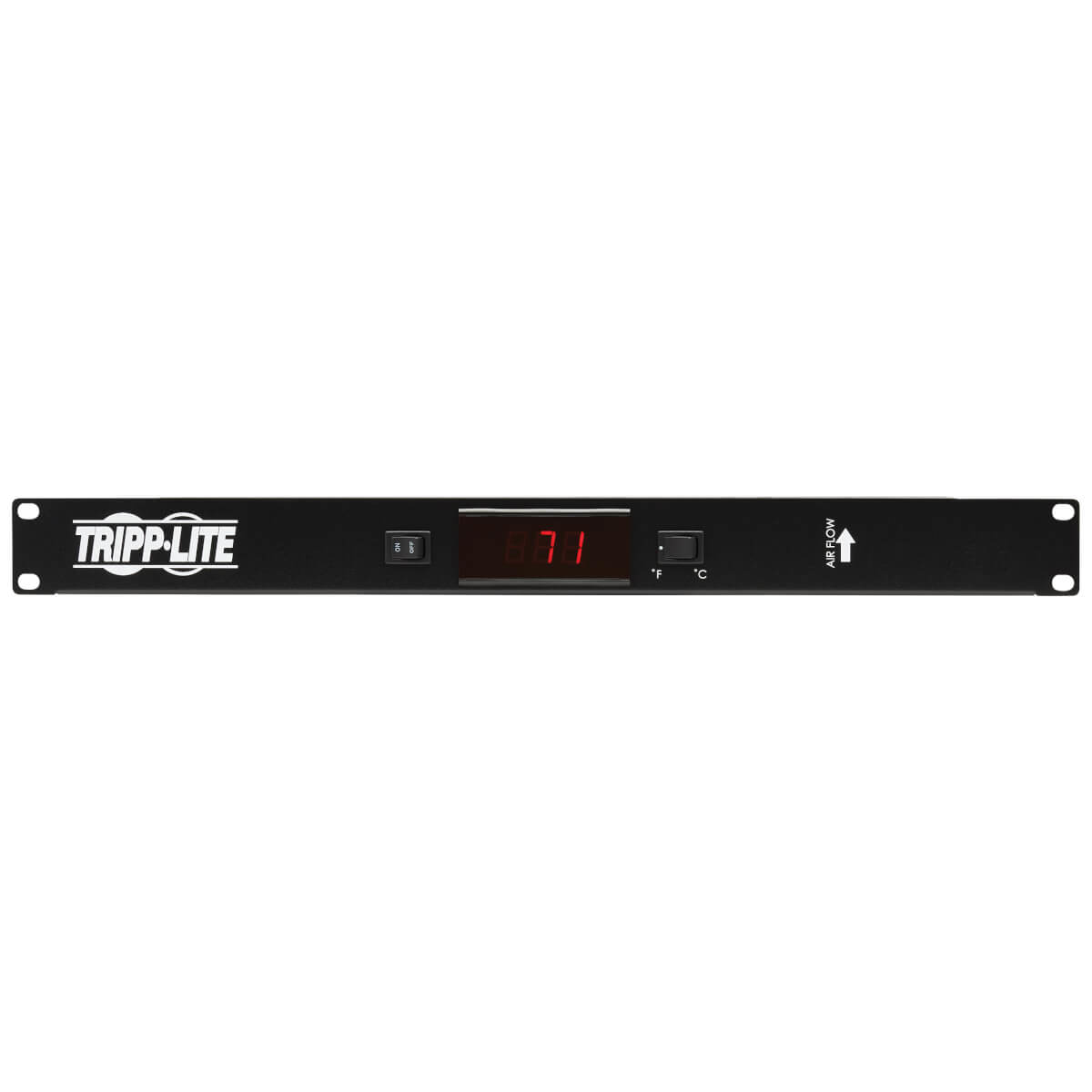 A front-panel LCD lets you monitor the rack temperature in either Fahrenheit or Celsius. One front rocker switch flips between °F and °C. The other turns the SRFAN1UTEMP on and off.