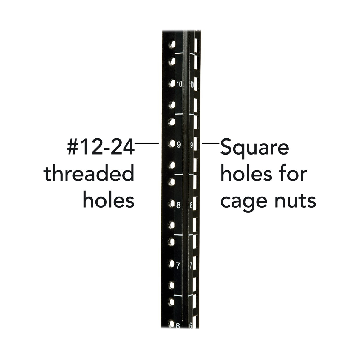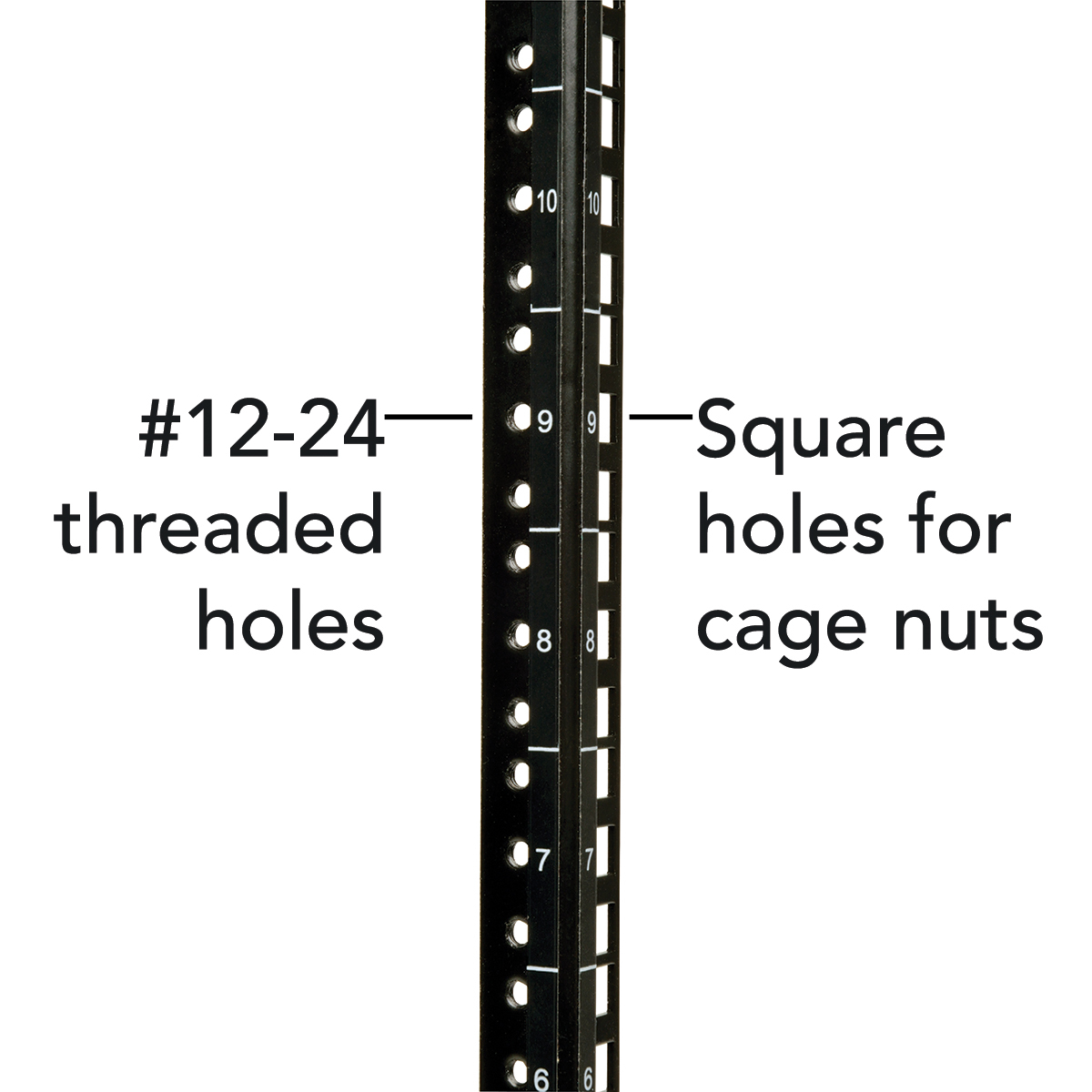 Rails support square-hole or 12-24 threaded-hole mounting