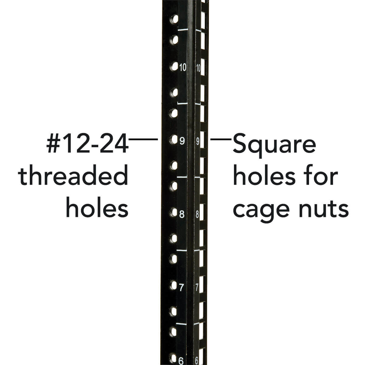 The SRW12US comes fully assembled and ready to mount to the wall, or use the optional SRCASTER rolling caster kit (sold separately) to make it a mobile rack. Square and 12-24 threaded mounting holes and numbered rack spaces make equipment installation easy. The vertical mounting rails adjust in 7/8-inch increments to accommodate equipment up to 20.5 inches deep, such as network switches and patch panels.