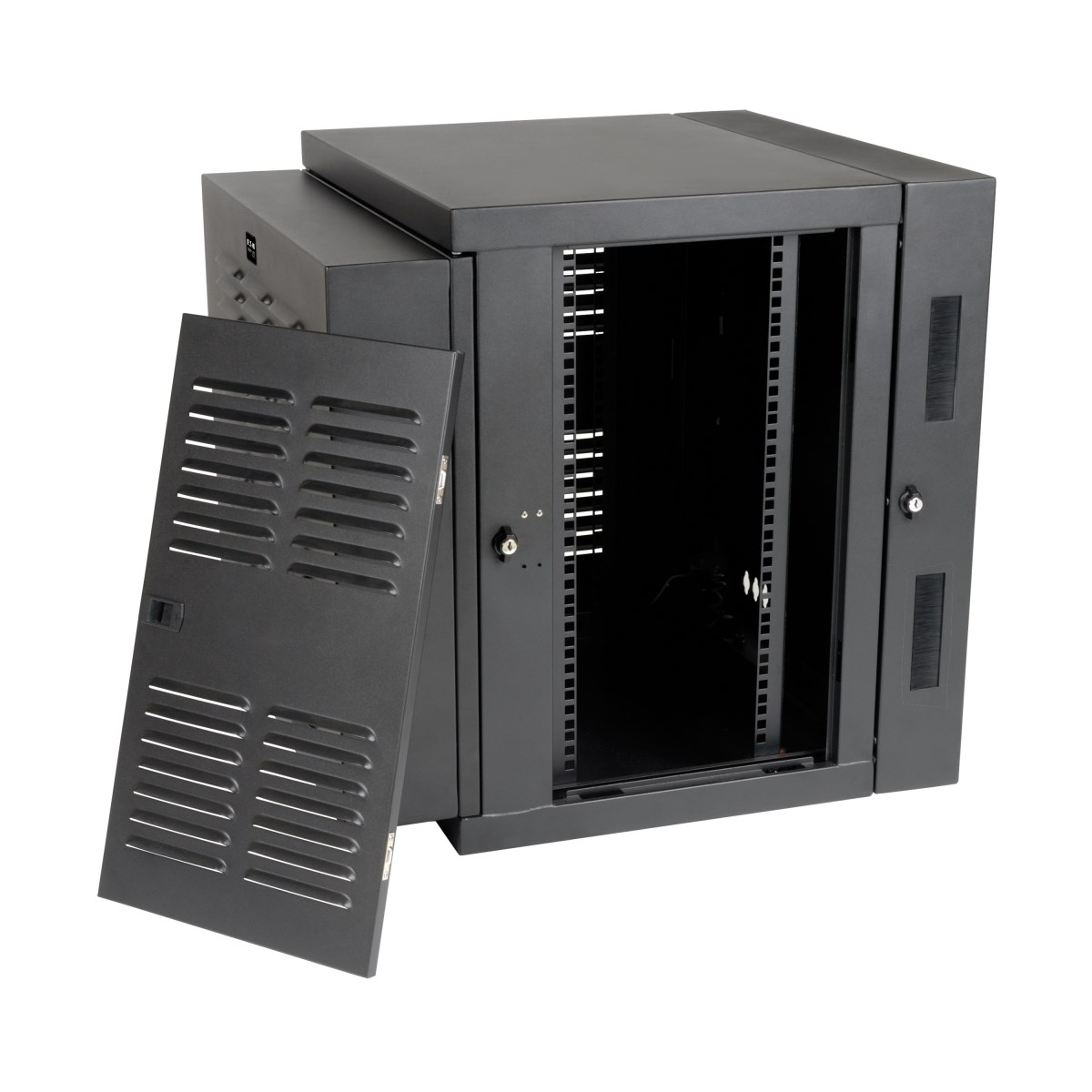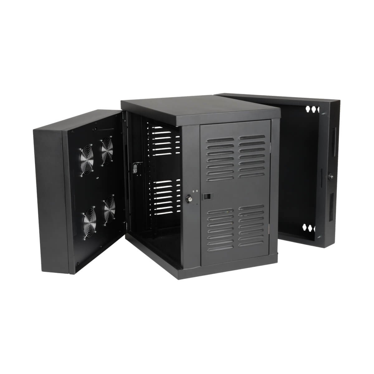 - Vented panels and built-in fans provide generous airflow to keep equipment cool