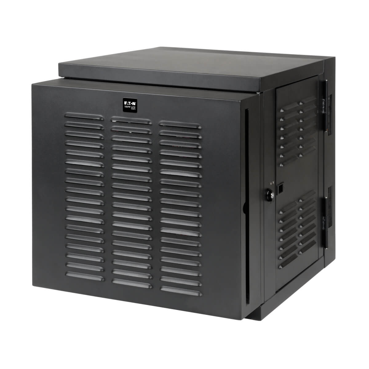 The SRW12USNEMA SmartRack 12U NEMA 12 Switch-Depth Wall-Mount Rack Enclosure Cabinet is designed to house EIA-standard 19-inch rack equipment in harsh, dirty work environments with limited floor space, such as factories, construction areas, utility plants, power stations, transportation terminals, distribution hubs and warehouses. Constructed from heavy-duty steel with a durable black powder-coated finish, the cabinet has a maximum load capacity of 90 kgs (200 lbs.) The SRW12USNEMA has a NEMA 12 (IP54) protection rating, protecting sensitive equipment against dirt, dust, lint, oil, drips and splashes. Its built-in air filter, louvered vents on the front door and side panels, sealed gasket around the door frames and brush strips around cable access points prevent dripping water, oil and airborne contaminants from getting inside. You can replace the air filter with standard, off-the-shelf furnace filters. Four high-performance intake fans built into the front door pull filtered air through the cabinet to keep your equipment cool. The cabinet swings away from the wall on a sturdy hinge, allowing easy back-door access to equipment and cabling during installation and maintenance. The reversible doors can open left or right. The doors and side panels lock securely to help prevent damage, tampering or theft. Convenient ports on the back door allow easy cable routing. The SRW12USNEMA comes fully assembled and ready to mount to the wall. Square and threaded mounting holes and numbered rack spaces make equipment installation easy. The vertical mounting rails adjust in 7/8-inch increments to house equipment up to 20.5 inches deep, such as network switches and patch panels.