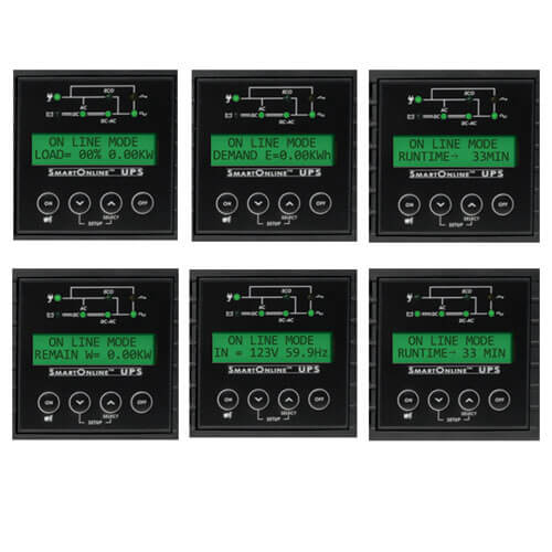 - LCD interface reports operating mode plus 9 selectable screens of UPS data (Load percentage, kW & kVA, Power factor, Input voltage & frequency, Output voltage & frequency, Battery voltage and charge percentage, Minutes runtime, Capacity remaining and Kw/hr. consumption)