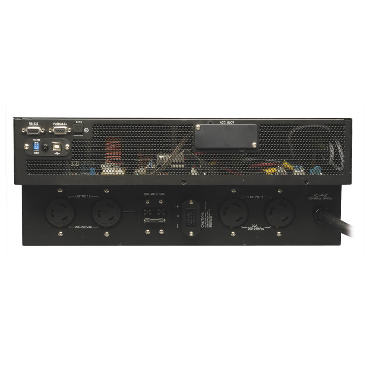 Tripp Lite SU5000RT4UHV 5000VA / 5kVA / 4500 watt on-line, double-conversion UPS system offers complete power protection for critical server, network and telecommunications equipment in a single 4U rack/tower compatible housing. Full-time active power conditioning provides clean, continuous dual-conversion AC output free of voltage fluctuations, power interruptions and line noise. Fault-tolerant auto-bypass prevents unexpected service interruptions during UPS overload or internal fault conditions. Single all-in-one rack / tower housing installs in only 4 rack spaces (4U) with a maximum installed depth of only 20.7 in. / 52.6 cm. Maintains full-time sine wave output within 2% of selectable 200/208/220/230/240V nominal during brownouts as low 100V and overvoltages as high as 300V. Expandable runtime is supported with optional BP192V12-3U external battery packs. Battery independent restart ensures automatic UPS power-up without user interaction after lengthy power outages, even when batteries are expired and require replacement. Double-conversion operation converts raw input from AC to DC, then resynthesizes output power back to perfect sine wave AC with enhanced protection from harmonic distortion, fast electrical impulses and other hard-to-solve power problems not addressed by other UPS types. Highly efficient operation in optional economy mode significantly reduces BTU heat output and operating energy costs. Network-grade AC surge and noise suppression. Supports detailed monitoring of equipment load levels, self-test data and utility power conditions via built-in RS-232 and USB interfaces. Optional SNMP/Web and contact-closure communications card accessories available. HID-compliant USB interface enables integration with built-in power management and auto shutdown features of Windows and Mac OS X. Included PowerAlert monitoring software offers detailed site power and UPS updates with support for safe auto-shutdown of connected systems as UPS batteries become depleted. Included software packages include PowerAlert Local, PowerAlert Network Shutdown Agent and PowerAlert Network Management System for complete support for a wide variety of application types. Supports Emergency Power Off (EPO) via built-in interface. Front panel LEDs and LCD readout with scroll controls support front-panel visual monitoring of all major UPS for a variety of control options to support advanced UPS settings and configurations. LED / LCD display panel rotates for viewing in rackmount or tower configurations. L6-30P input, plus two L6-30R and two L6-20R outlets. External battery packs are field replaceable and hot swappable. $250,000 connected equipment insurance;