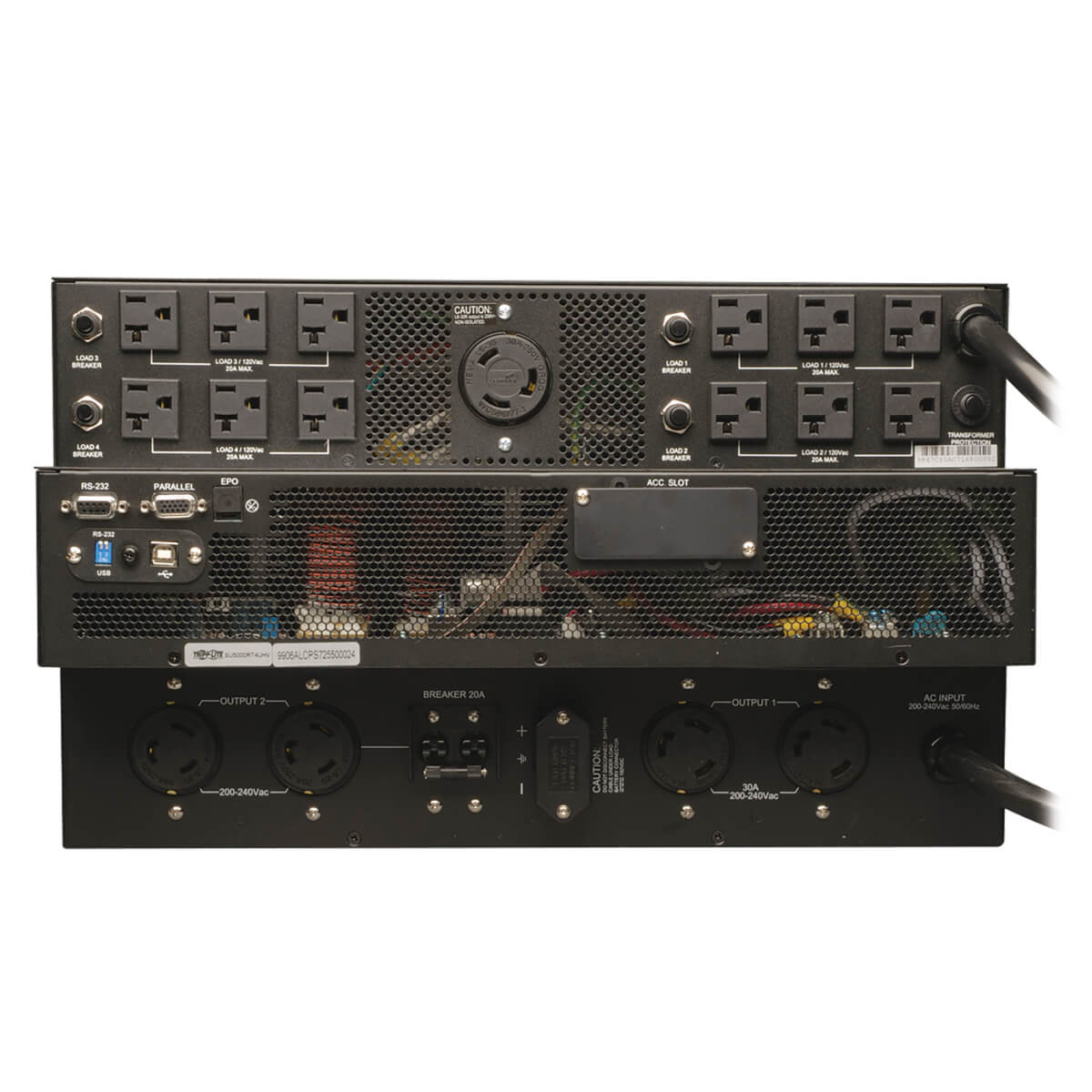 - Tripp Lite SU5000RT4UTF 5000VA / 5kVA / 4500 watt on-line, double-conversion UPS system in a 6U rack/tower configuration (4U UPS power module with internal batteries + 2U step-down transformer)