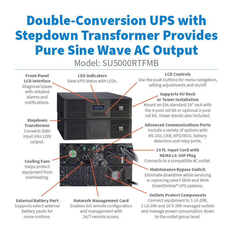 You can mount the SU5000RTFMB in 6U of space in an EIA-standard 19-inch rack using the included 4-post rail kit or an optional 2-post rail kit (RK2PC, sold separately, one required for each UPS, EBM or transformer). You can also adapt it for tower installation using the included support stands. The 10-foot power cord with NEMA L6-30P plug connects to a compatible AC outlet. A cable gland is included for alternate hardwire input.