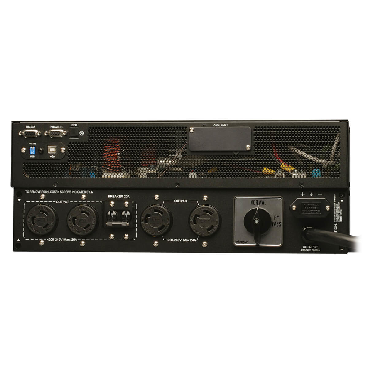 Featuring true on-line operation with pure sine wave output, zero transfer time to battery and complete UPS replacement capability with no downtime, the SU6000RT4UHV provides the highest level of protection available for mission-critical equipment from power outages, voltage fluctuations and transient surges. It converts incoming AC power to DC, and re-converts it back to filtered AC output with a pure sine wave, isolating connected components from all power problems in high-voltage environments. The SU6000RT4UHV has a 6kVA/5400W capacity and 4 AC outlets (2 L6-20R; 2 L6-30R).With its detachable PDU, the SU6000RT4UHV is easily hot-swappable by a user of any skill set—no need for lengthy and expensive service calls, and no downtime if a repair or battery replacement is needed. In bypass mode, the PDU passes power to equipment without the use of the power and battery modules, allowing them to be removed while keeping your application in operation. UPS battery backup keeps connected equipment operational through short power failures, and provides time to save data and perform an orderly system shutdown in case of a prolonged blackout. The SU6000RT4UHV‘s runtime can be expanded with optional external battery packs.The SU6000RT4UHV features a highly efficient (96%) economy mode setting that can significantly reduce a facility's energy costs by minimizing heat output, reducing cooling requirements and consuming less electricity.An LCD display with LED indicators enables IT personnel to monitor operating modes and conditions. The LCD/LED panel rotates for viewing in horizontal rack or vertical tower installations and includes an audible alarm that signals various conditions.The SU6000RT4UHV features a USB port and a DB9 port that, when used with Tripp Lite's included PowerAlert software, provide comprehensive network power monitoring and control. An optional SNMPWEBCARD accessory can enable the UPS to operate as an IP managed device.The unit requires only 4U of rack space in a standard rack enclosure and can be installed in a 2-post rack using the 2POSTRMKITHD accessory, or in a tower configuration with the 2-9USTAND accessory.The SU6000RT4UHV comes with $250,000 Ultimate Lifetime Insurance (U.S., Canada, and Puerto Rico only) for connected equipment and a 2-year warranty.