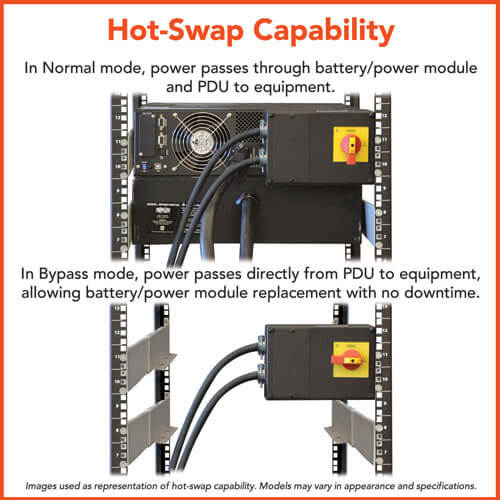 Detachable PDU with manual bypass switch enables hot-swappable UPS power module replacement with no interruption in output power to connected networking equipment