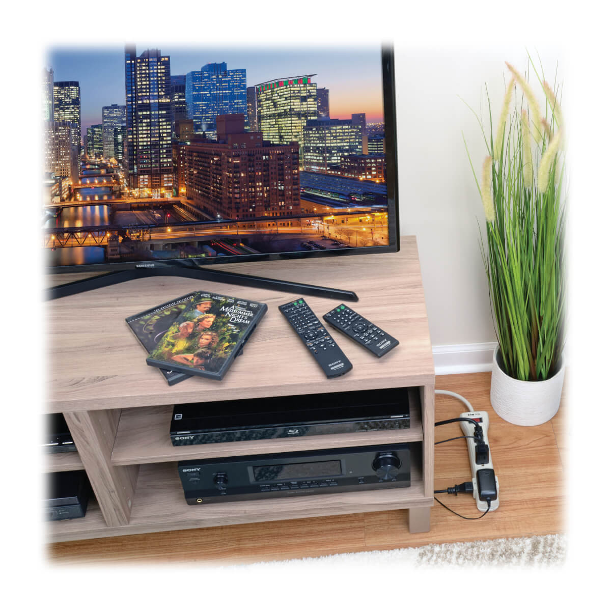 Your devices plug into seven NEMA 5-15R outlets. Two outlets are mounted on the side to allow connection of three bulky transformers without blocking adjacent outlets. An integrated 15A circuit breaker protects all outlets and shuts down connected equipment in case of overload. The on/off switch provides one-touch control over connected equipment. Diagnostic LEDs confirm grounding and protection status.